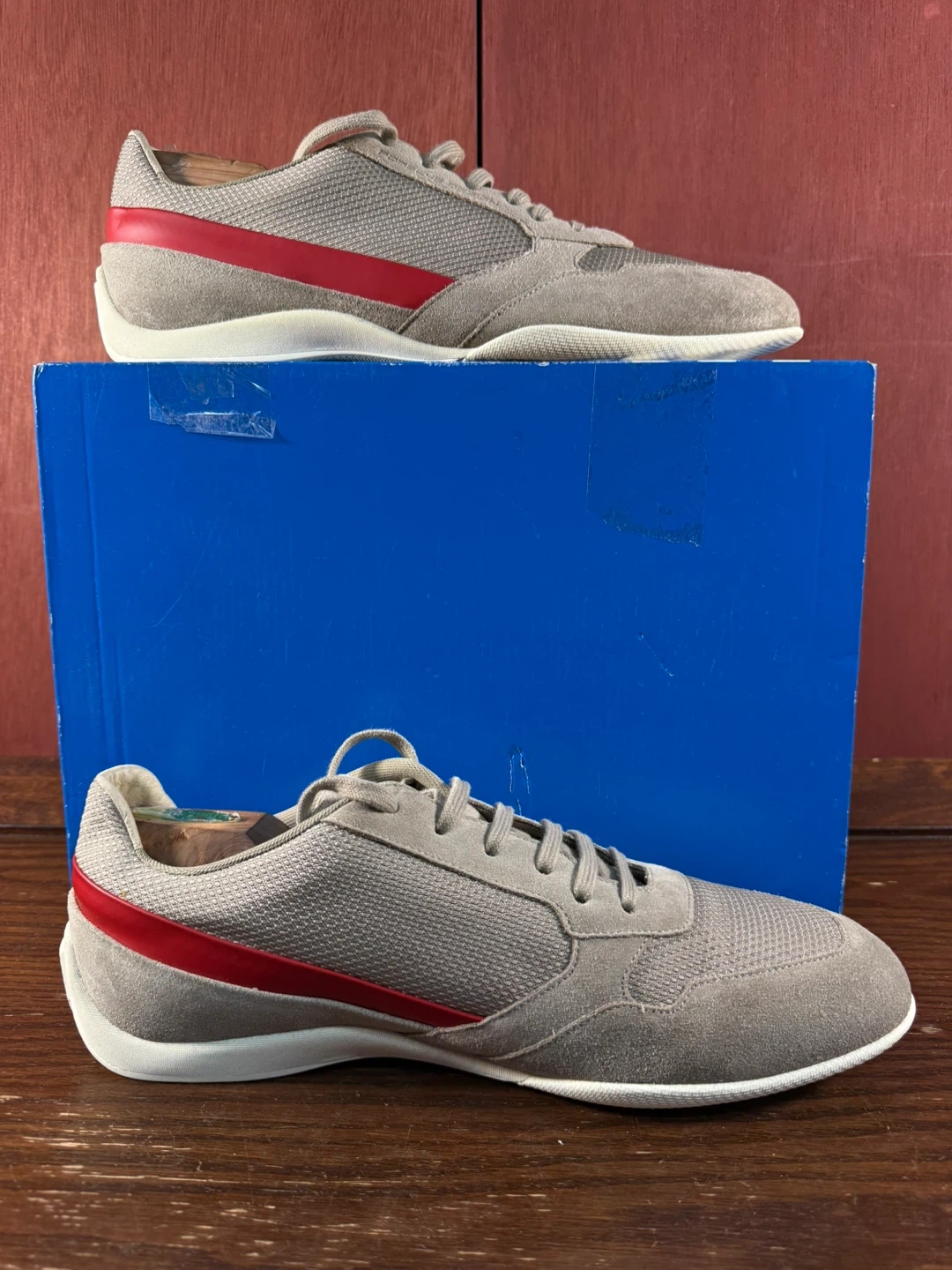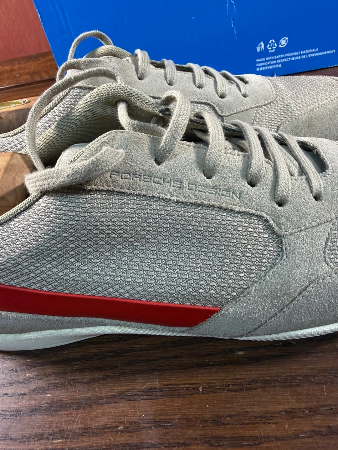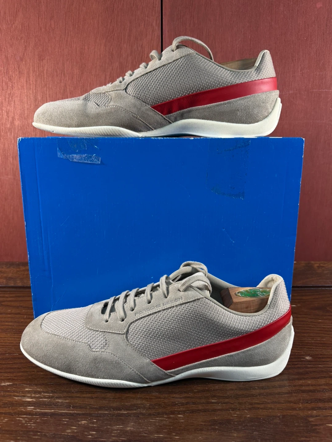 Elevate your footwear game with these Porsche Design Racer Velours Mesh Asphalt sneakers in men's size 11! These sneakers feature a stylish grey velours and mesh upper with a distinctive red stripe.