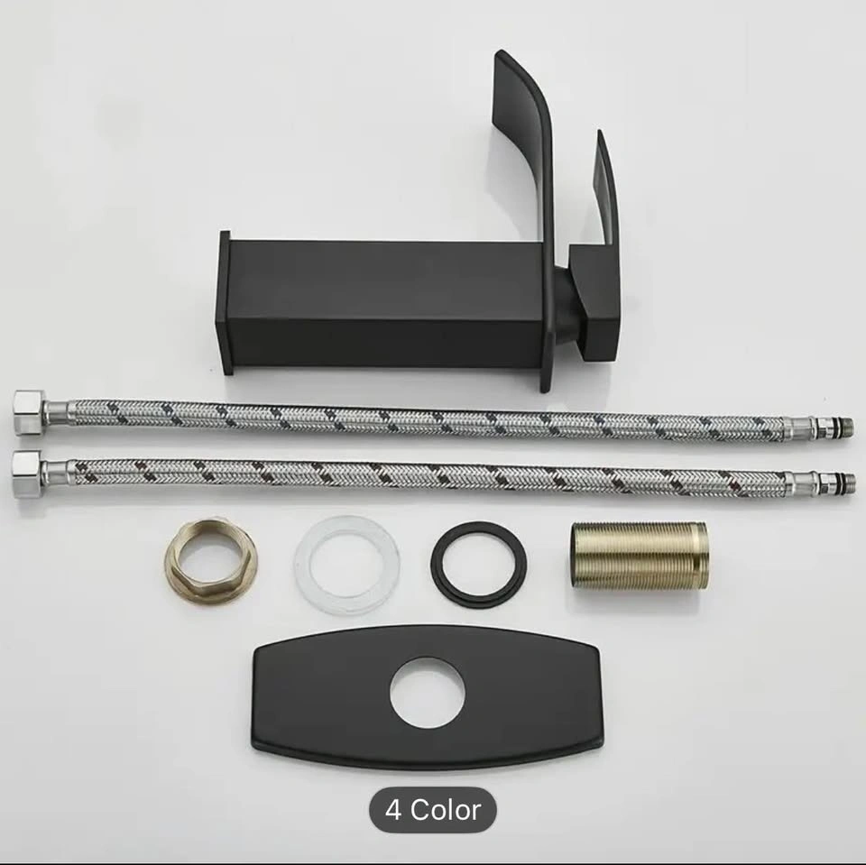 Single handle bathroom sink faucet with a waterfall spout. Suitable for RV lavatories and vanities. Can be installed on sinks with one or three holes and comes with water supply lines. Finished in matte black.