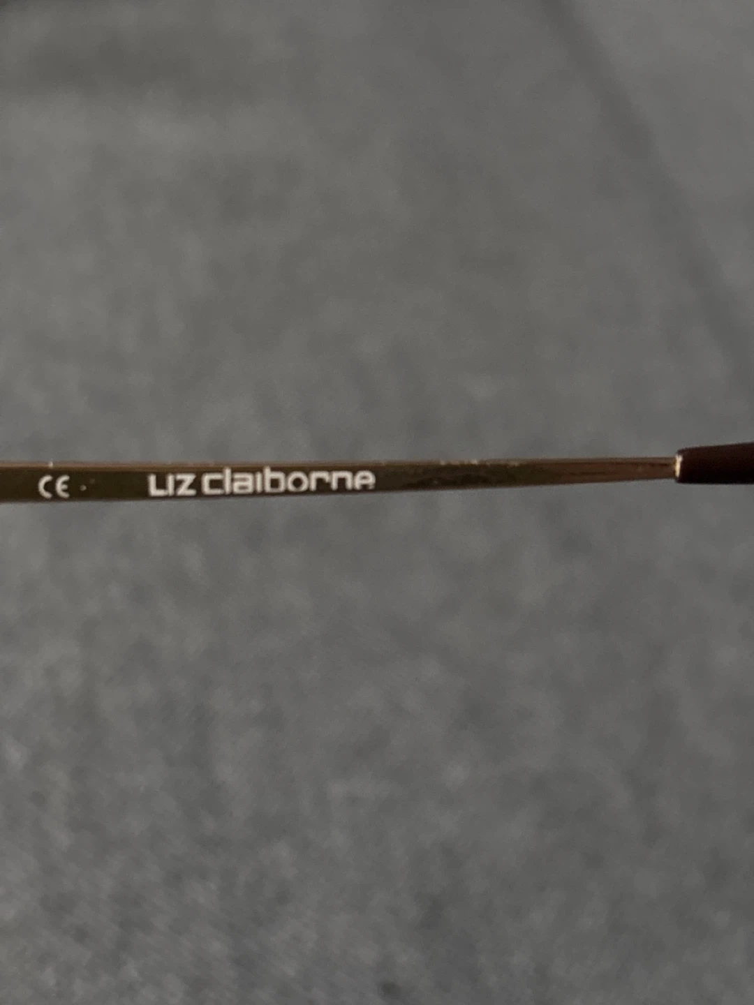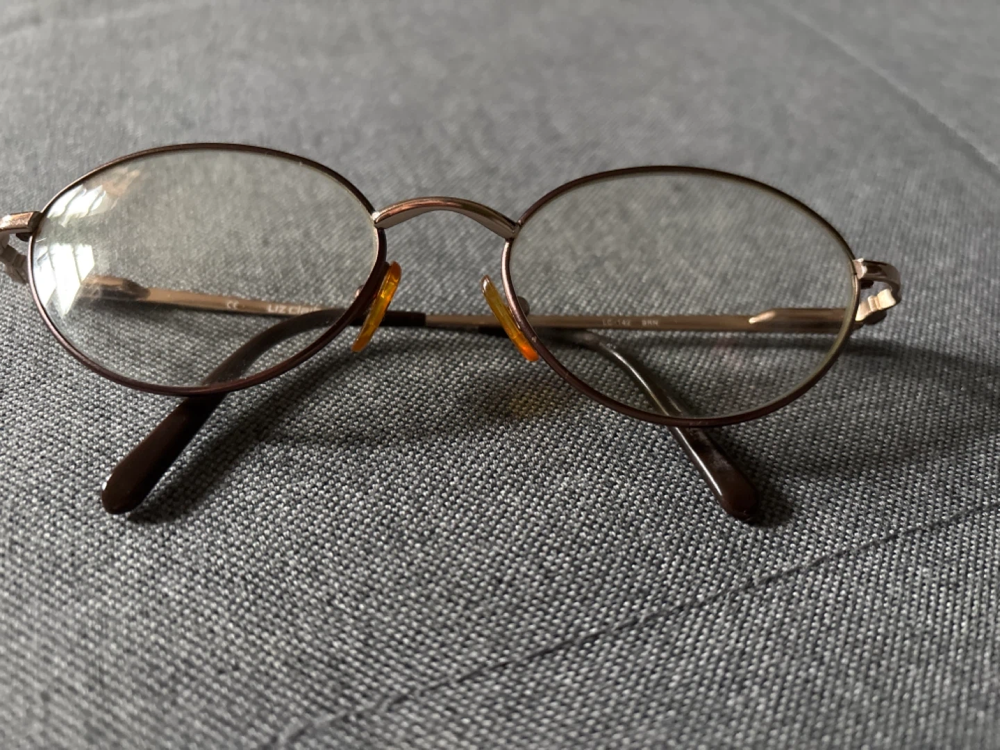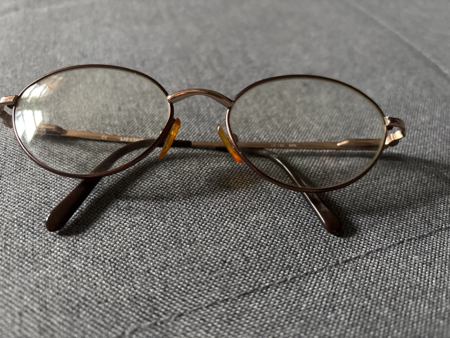 These are Liz Claiborne oval eyeglasses frames. They're a warm bronze color with adjustable nose pads. The arms have a brown tortoiseshell pattern detail.