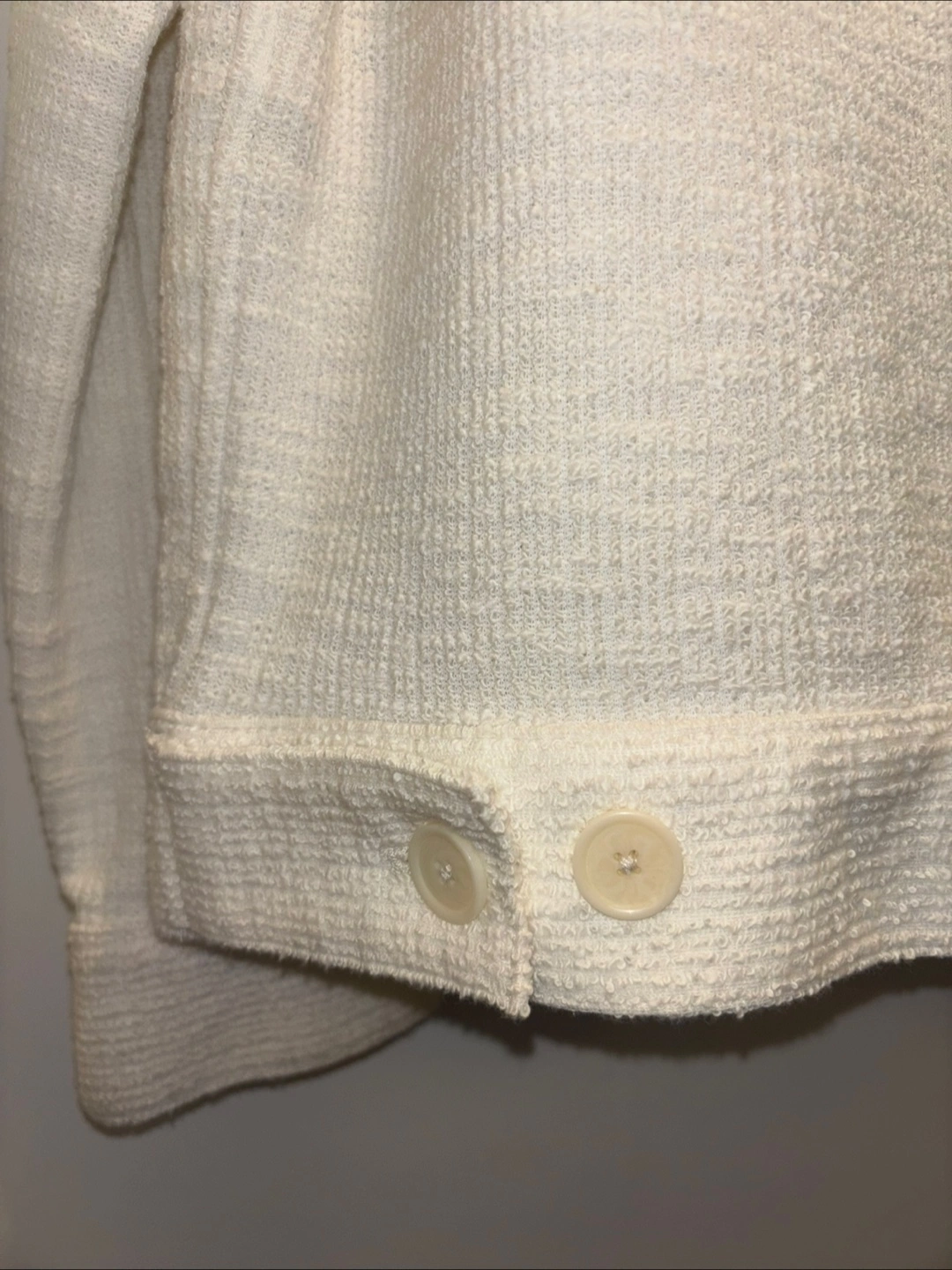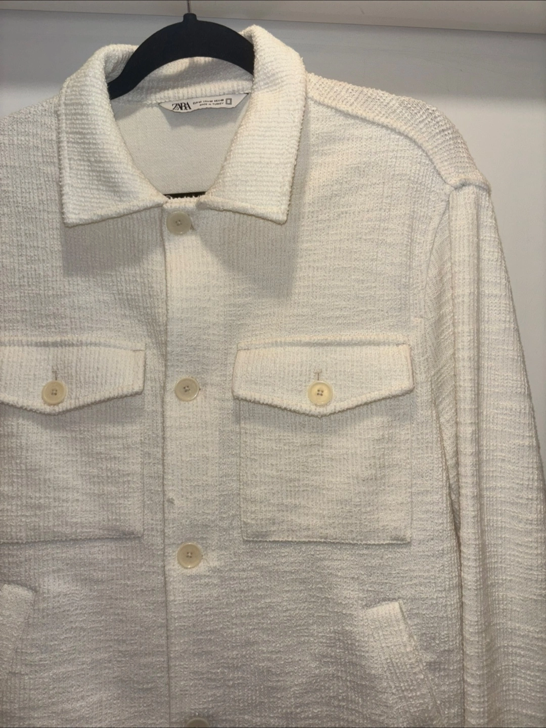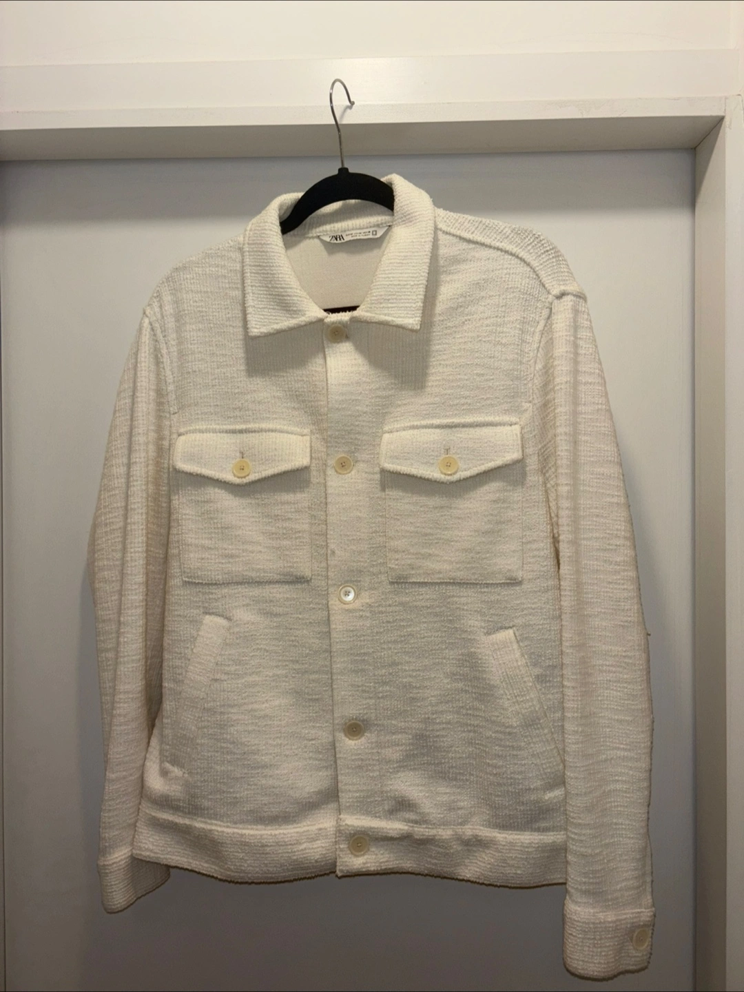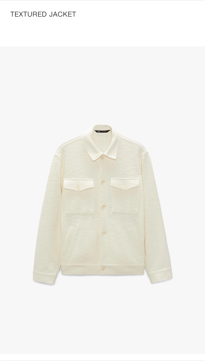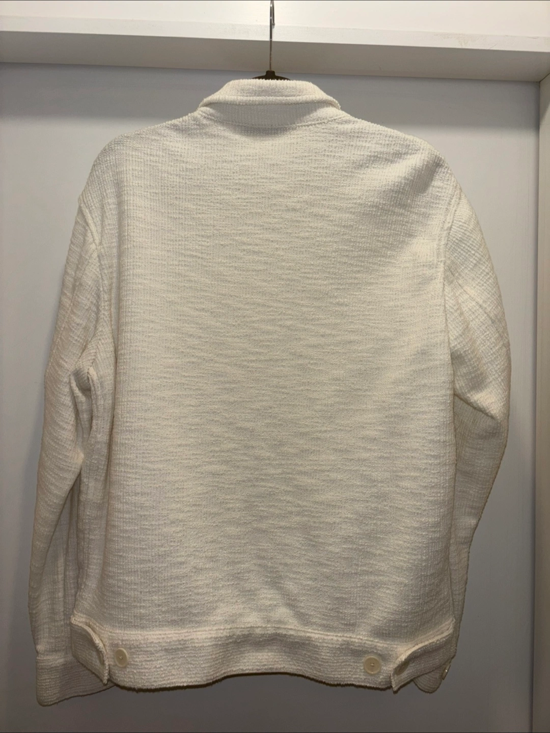 Ecru textured jacket. Features a collared neckline, button closure, and two flap pockets. Long sleeves. Made in Turkey.