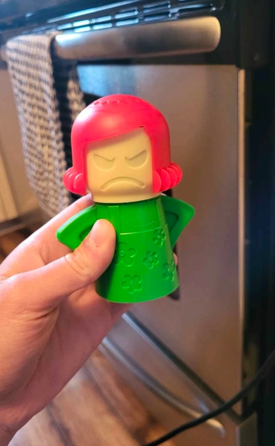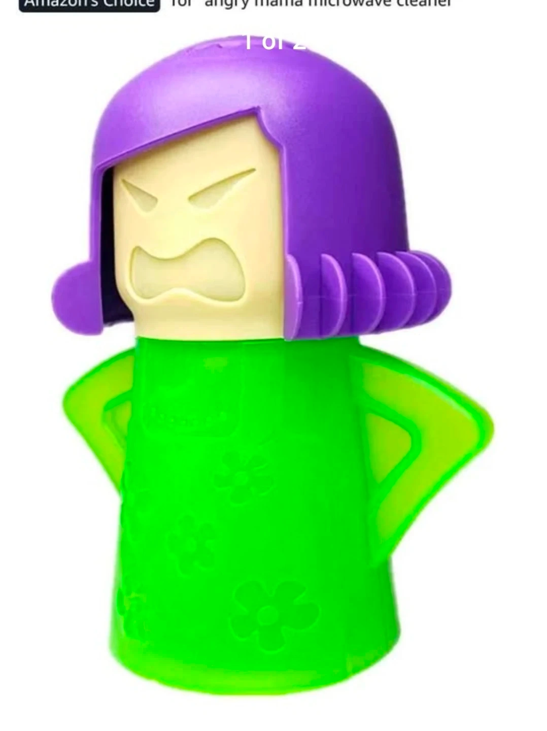 This is the Angry Mama microwave cleaner. It uses steam to help clean your microwave. Just add vinegar and water, then microwave for 5 minutes. It's a fun way to tackle microwave messes!