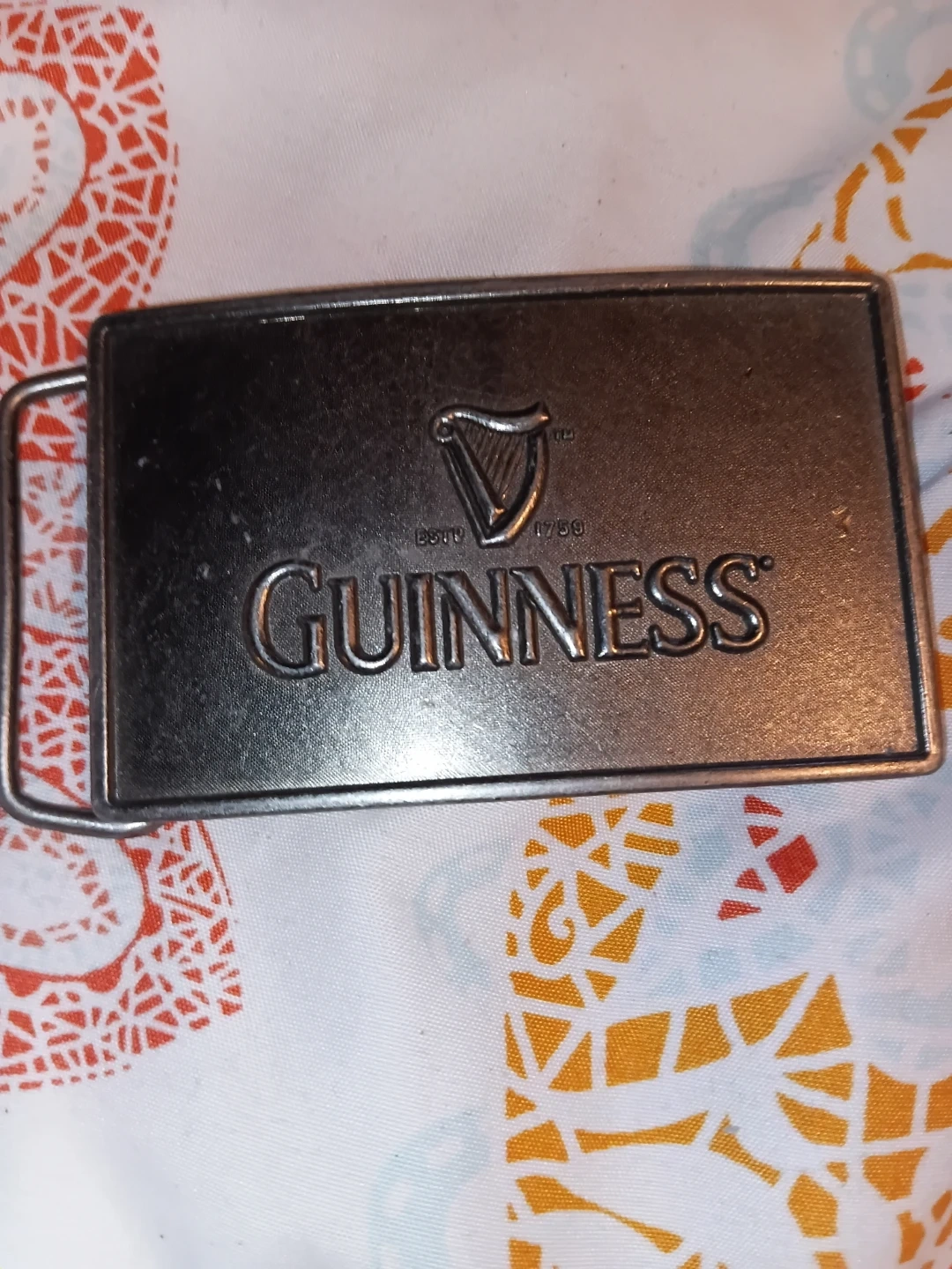 A vintage Guinness belt buckle featuring the iconic harp logo. It's made of metal and has "ESTD 1759 GUINNESS" embossed on it. This buckle is a great accessory for any fan of the famous stout!