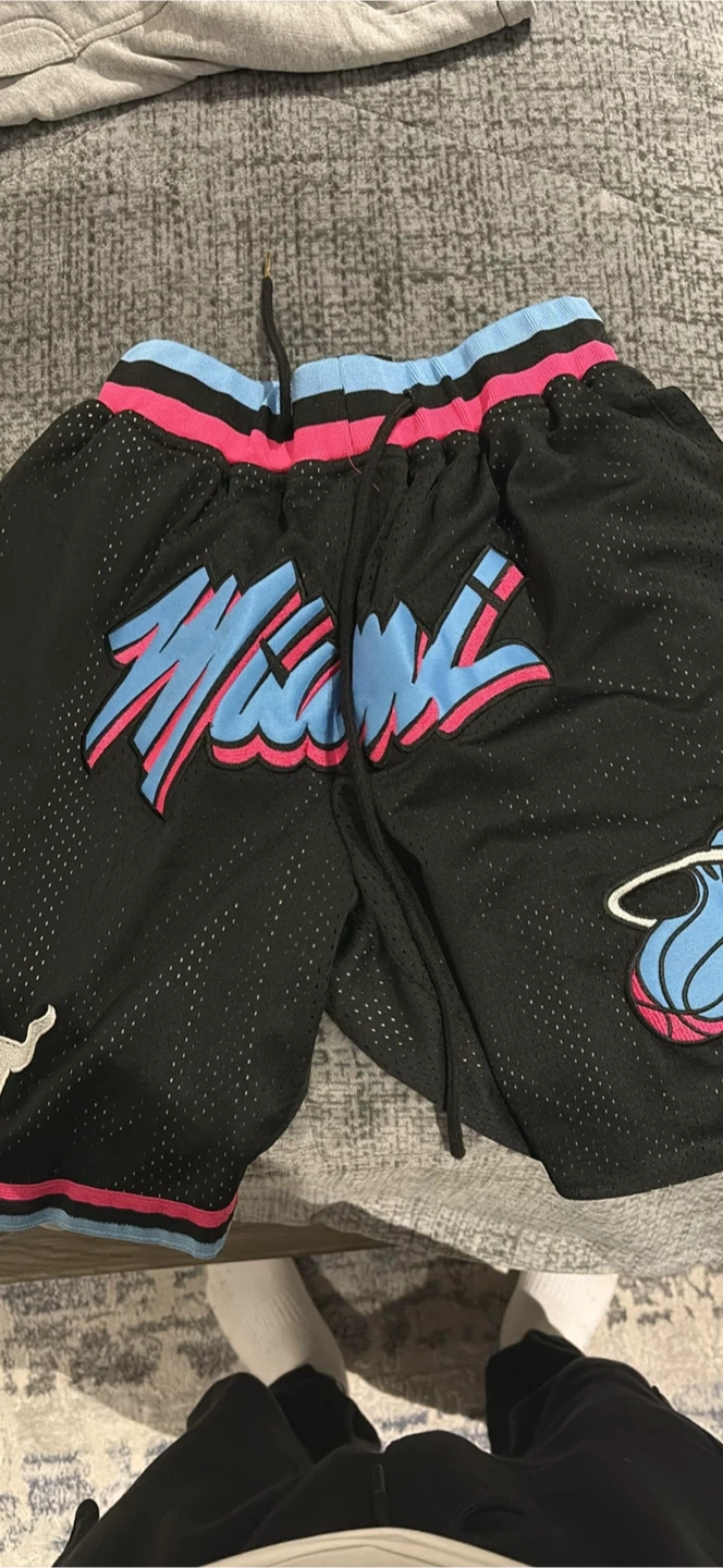 Black Miami Heat basketball shorts with pink and blue trim. Mesh material with embroidered logos. Drawstring waist for a secure fit.