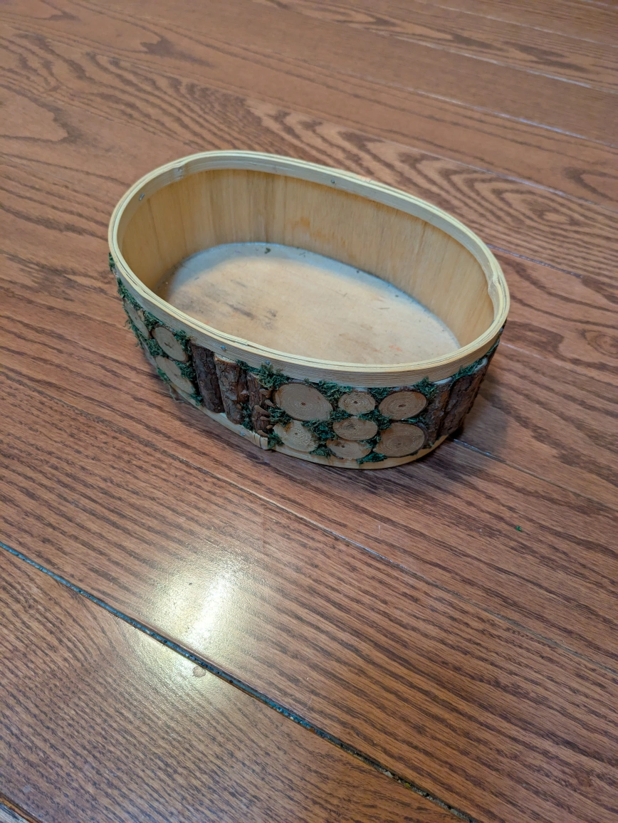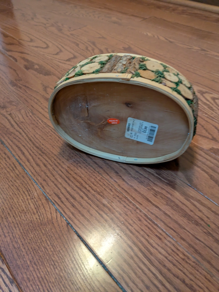 Here's a cute wooden decorative basket, perfect for adding a rustic touch to your home decor! It features a lovely design with small wooden logs around the edge. The original price tag shows it was $5.99.