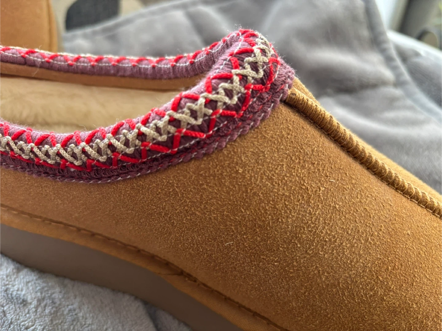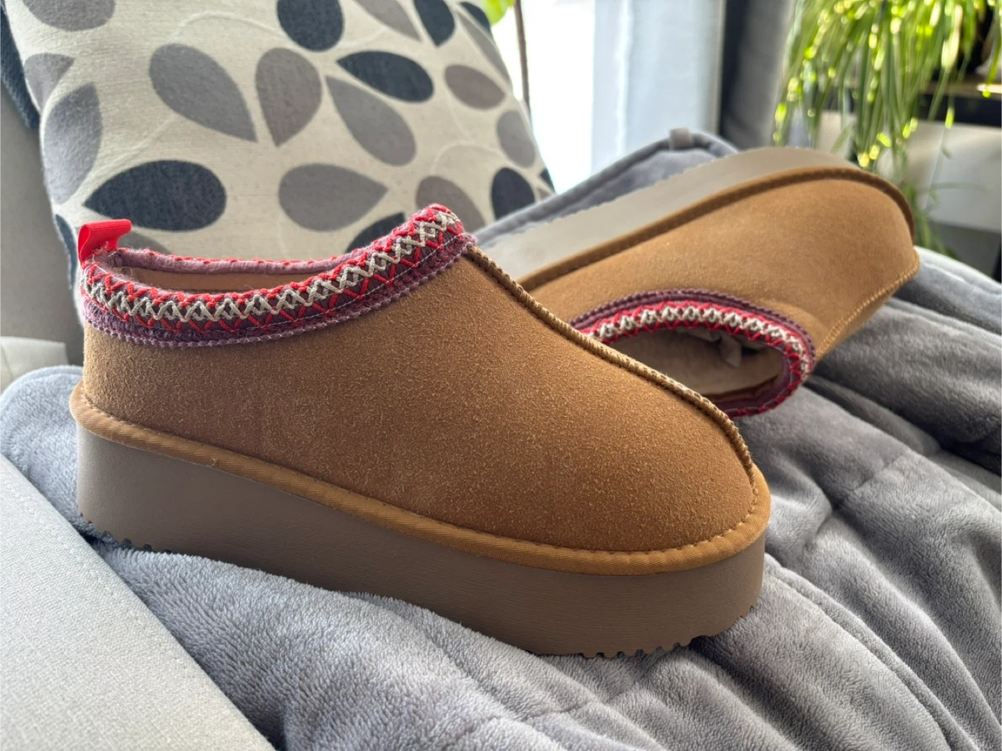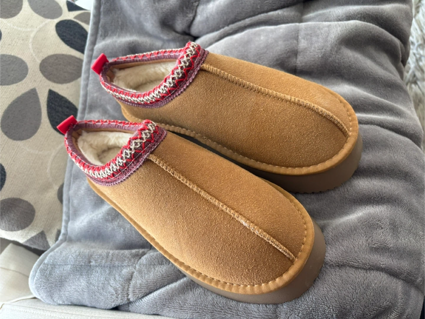 Cozy brown suede slipper mules with a faux shearling lining. These slip-on shoes feature a decorative knit trim and a durable rubber sole. Size 40.