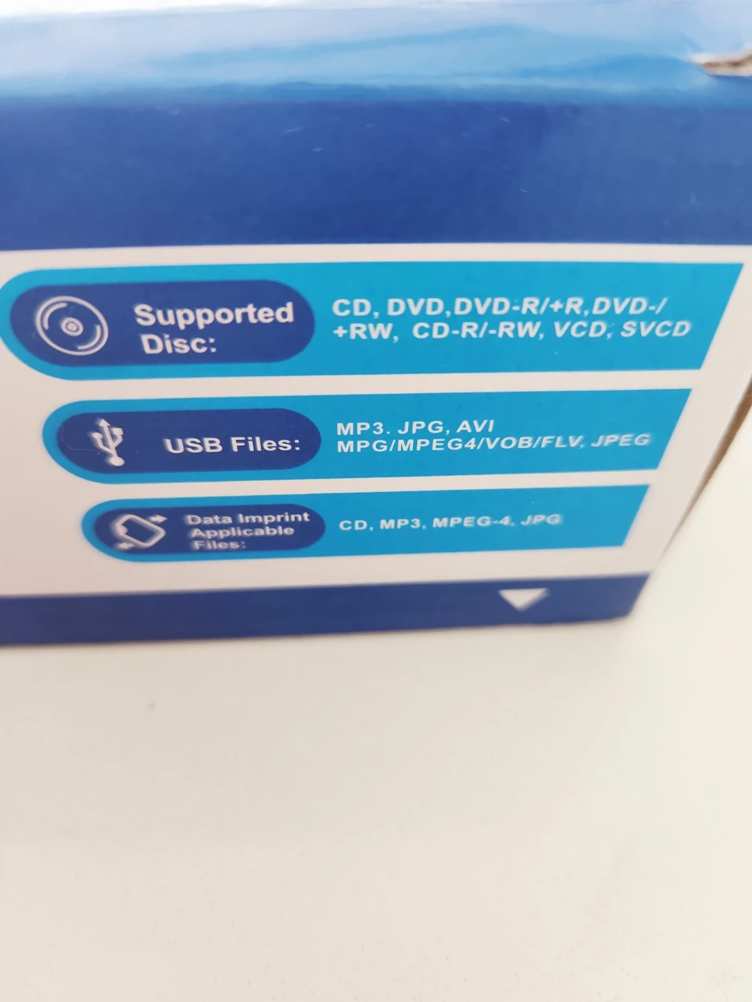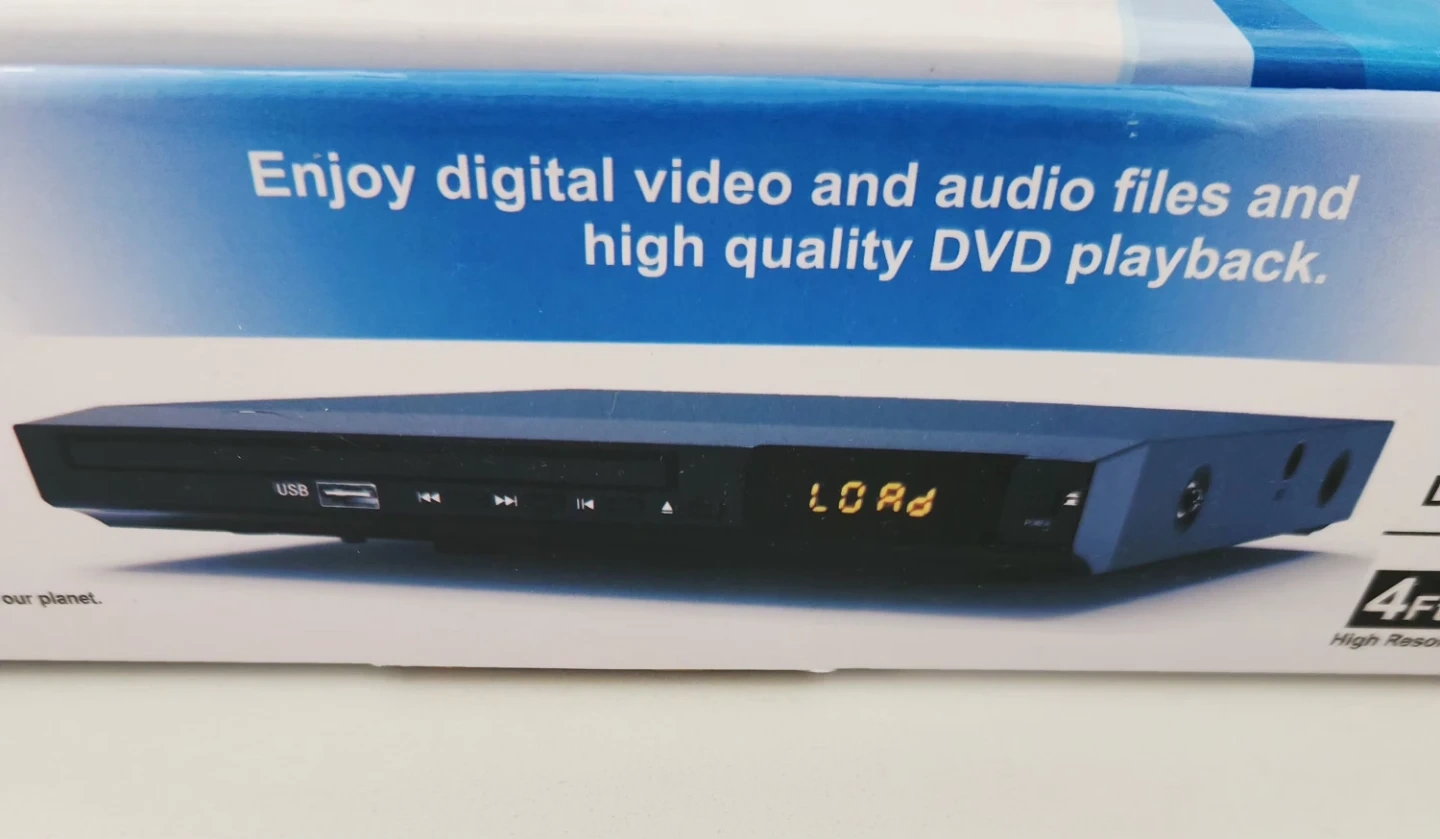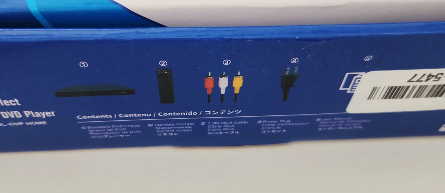 This is The Perfect Home DVD Player, model HD DVD-MT. It supports CD, DVD, DVD-R/+R, DVD-R/+RW, VCD, and SVCD discs. It also plays MP3, JPG, and AVI files via USB. It comes with a remote control, RCA cable, and power plug.