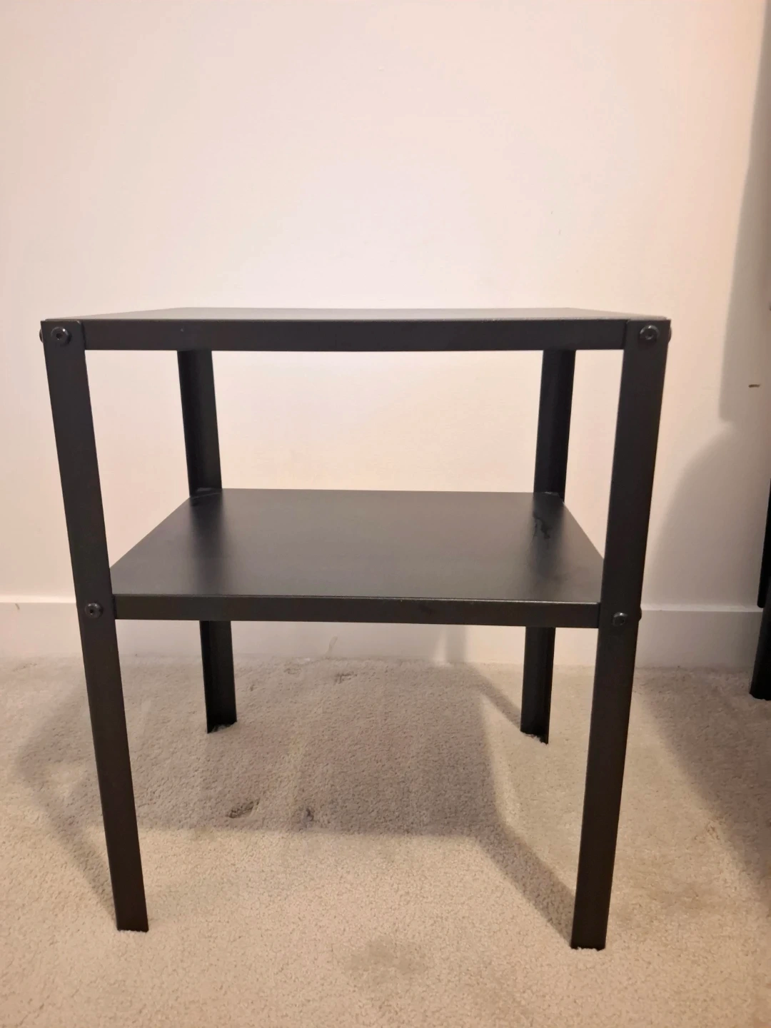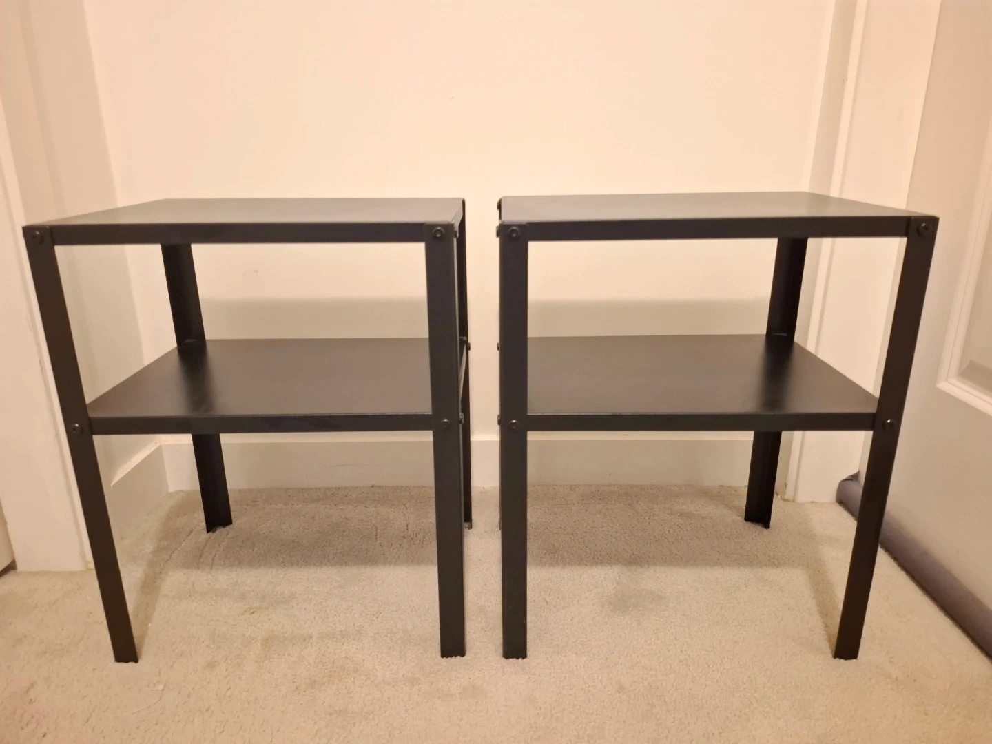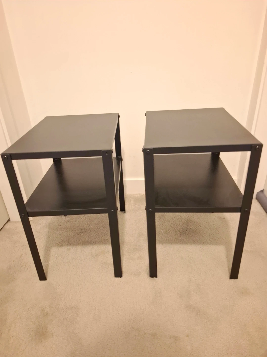Selling a pair of black metal side tables. Each table has two tiers, offering storage and surface space. Made of metal, these are sturdy and versatile.