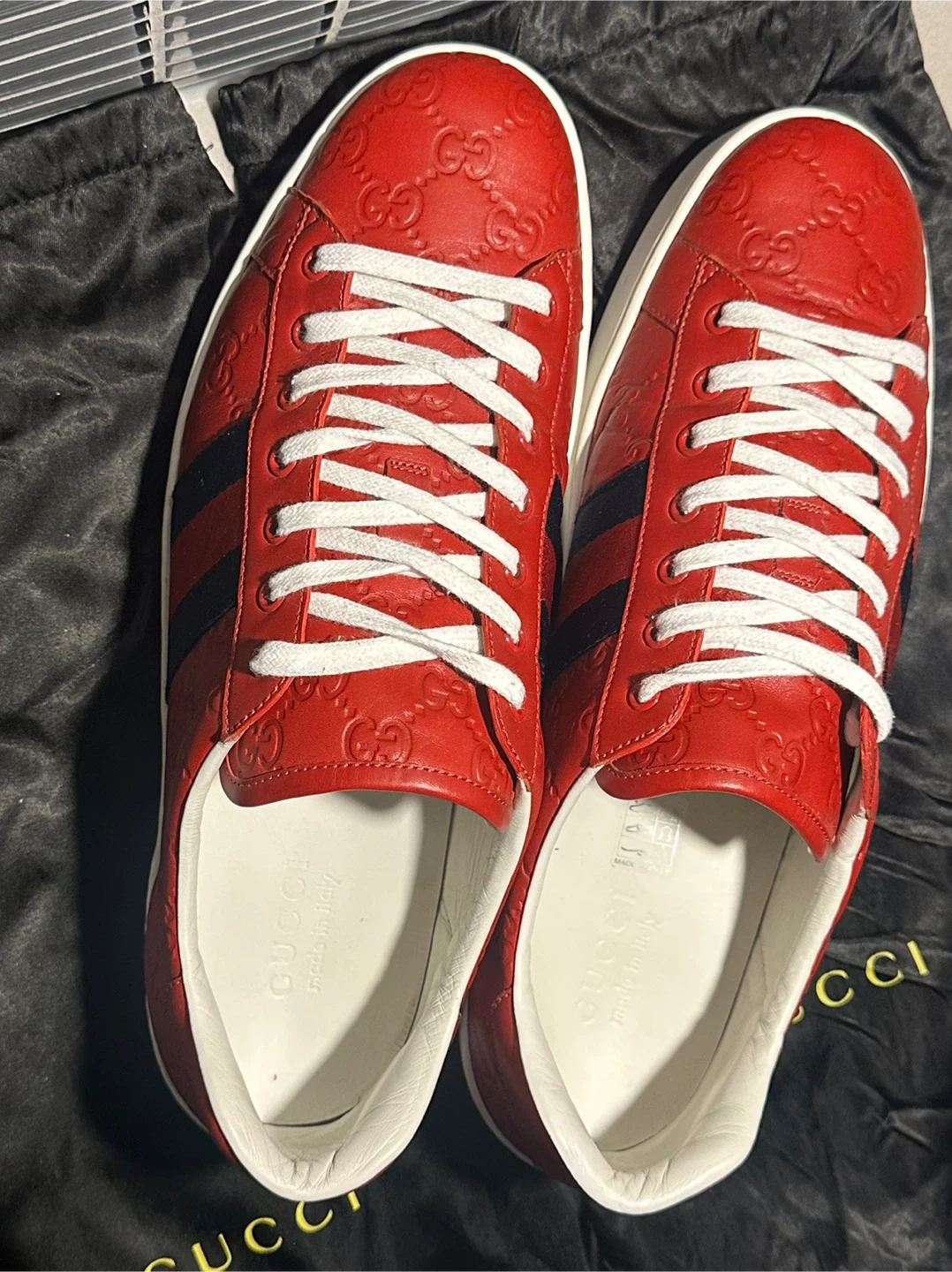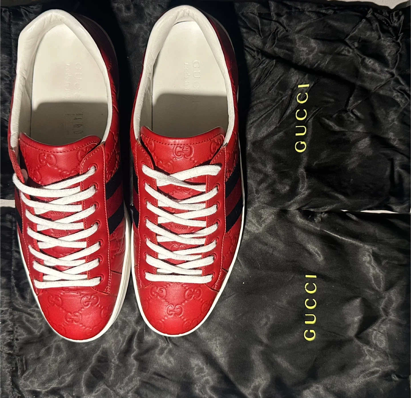 Selling a pair of Gucci sneakers in red leather. They feature the classic Gucci Ace Web Gg Monogram Low Top Sneakers Red. Comes with a Gucci dust bag!