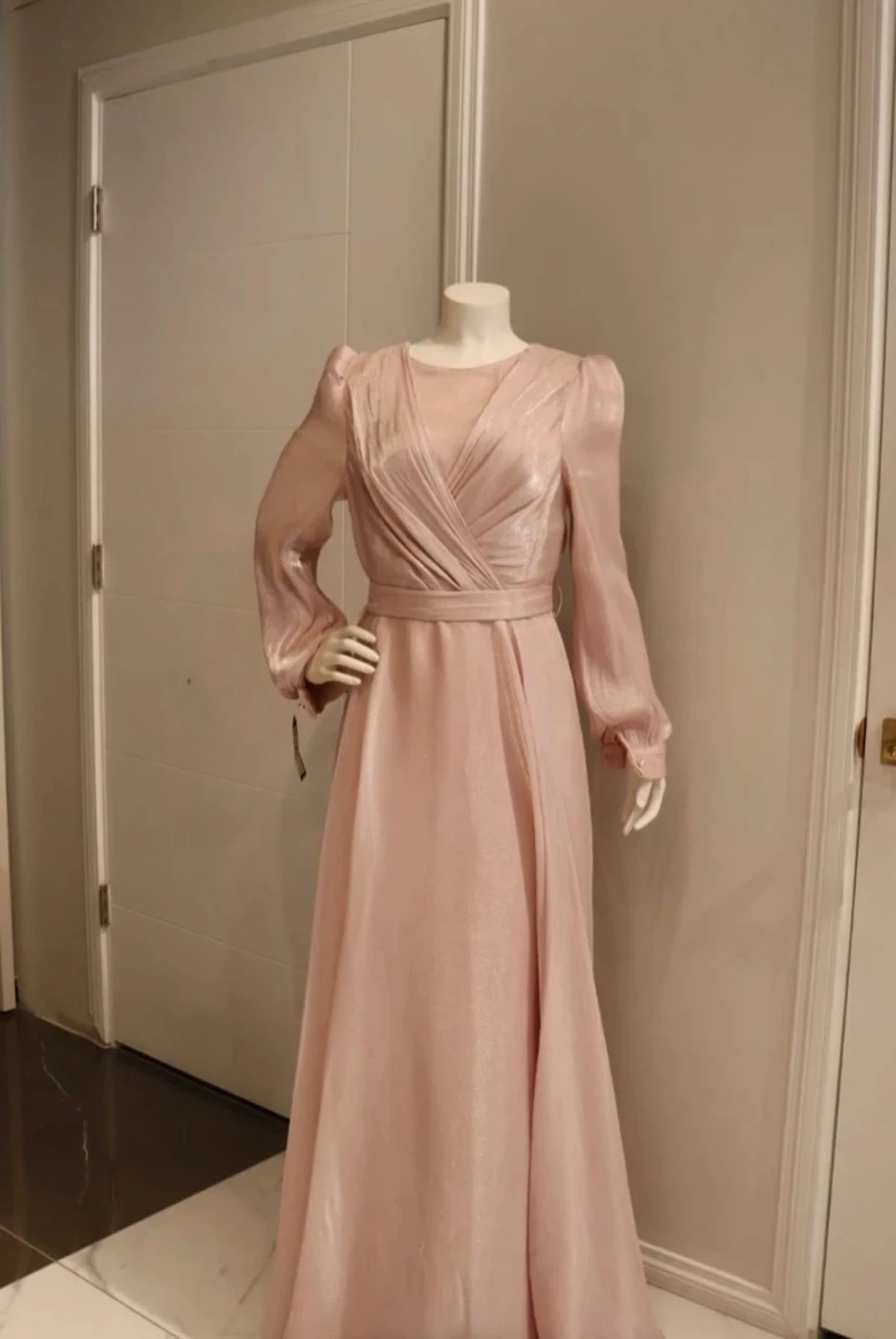Elegant pink maxi dress with a shimmering metallic finish. It features a flattering V-neckline with wrap detailing and long, billowy sleeves. The dress includes a matching fabric attached belt to cinch the waist. Perfect condition worn for a couple of hours.