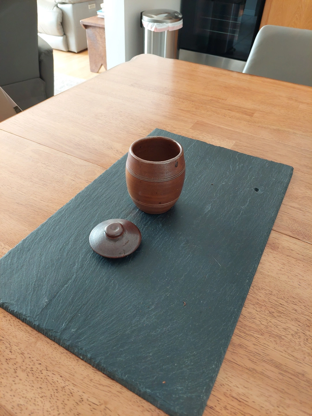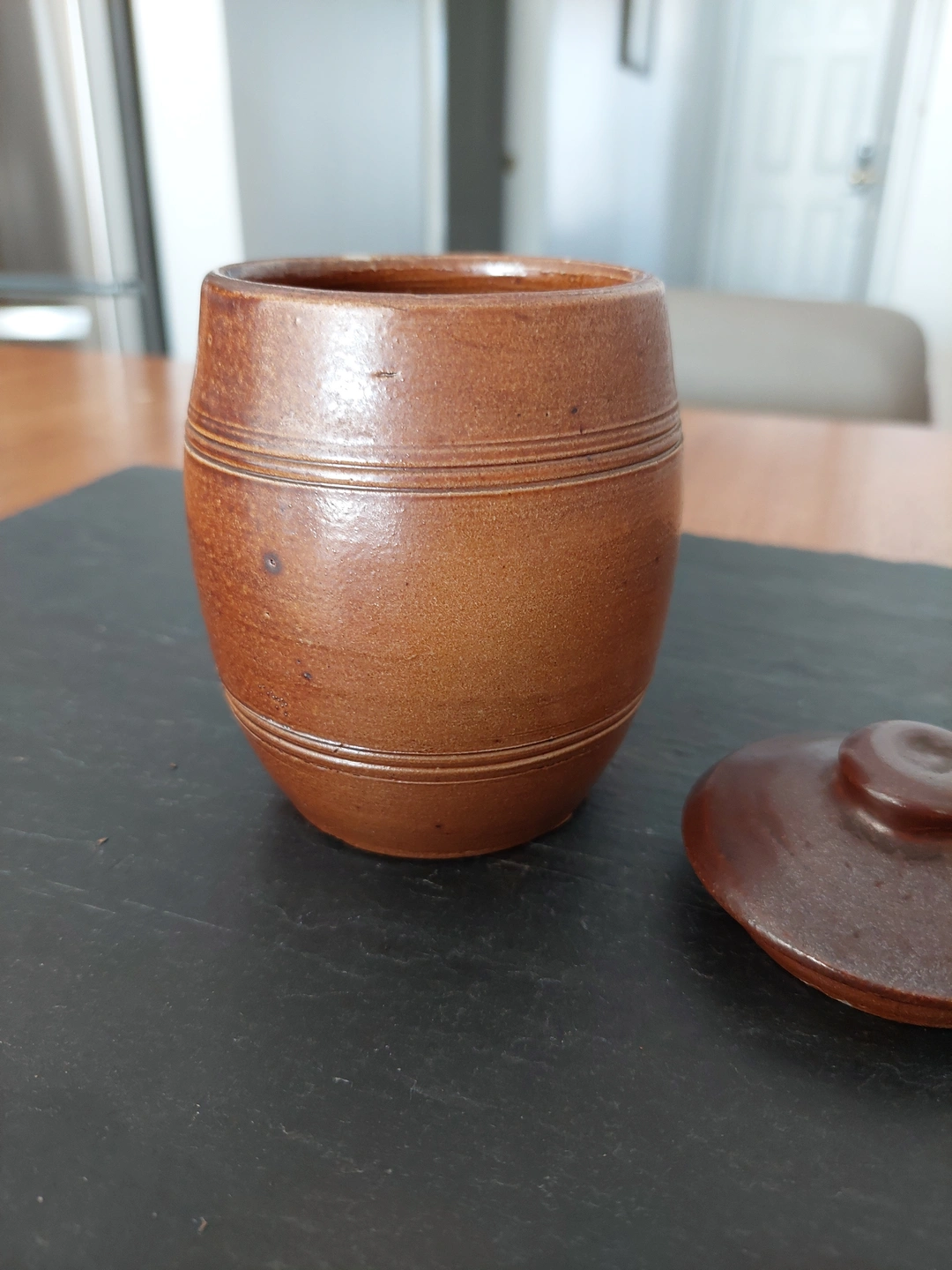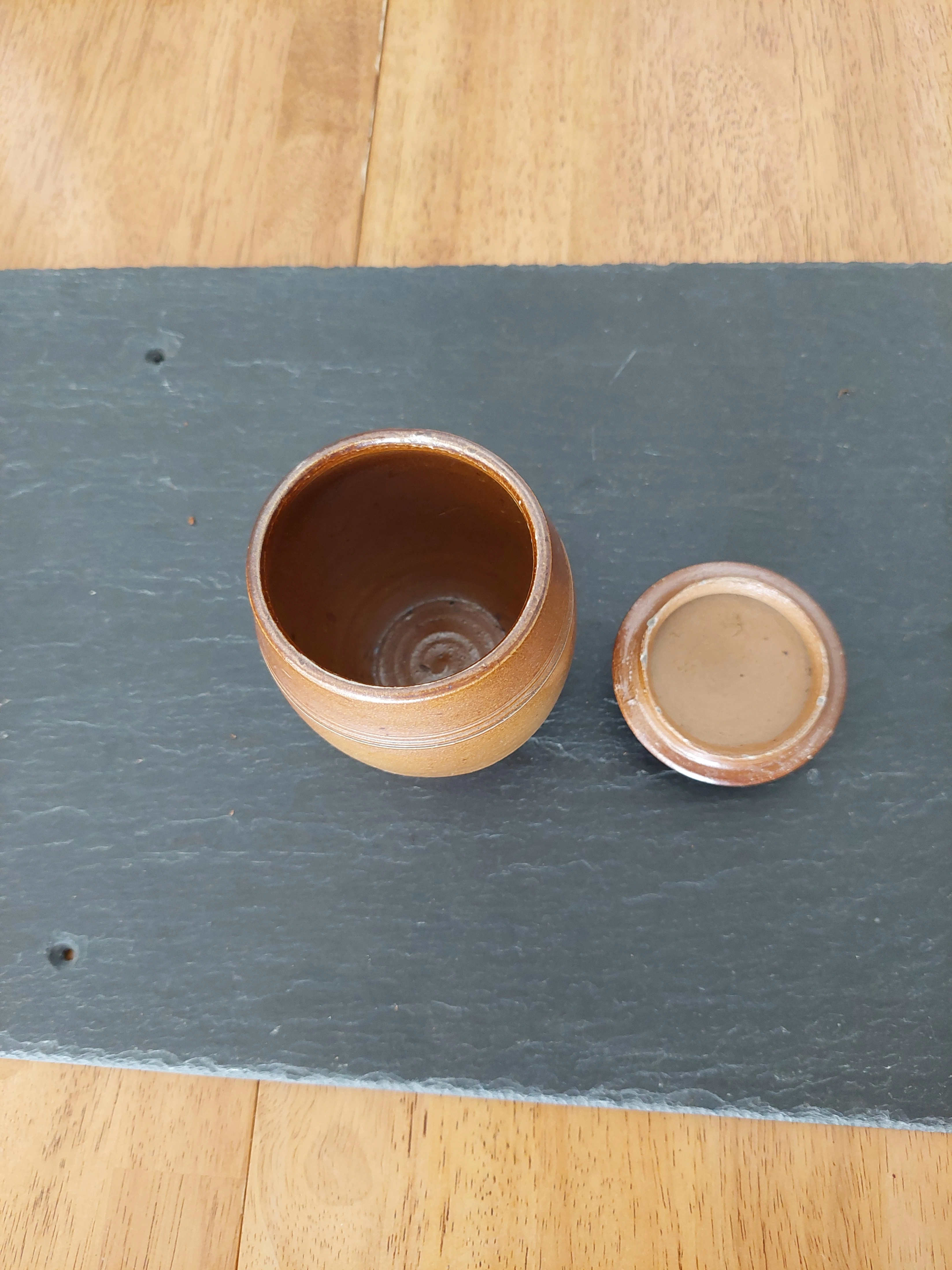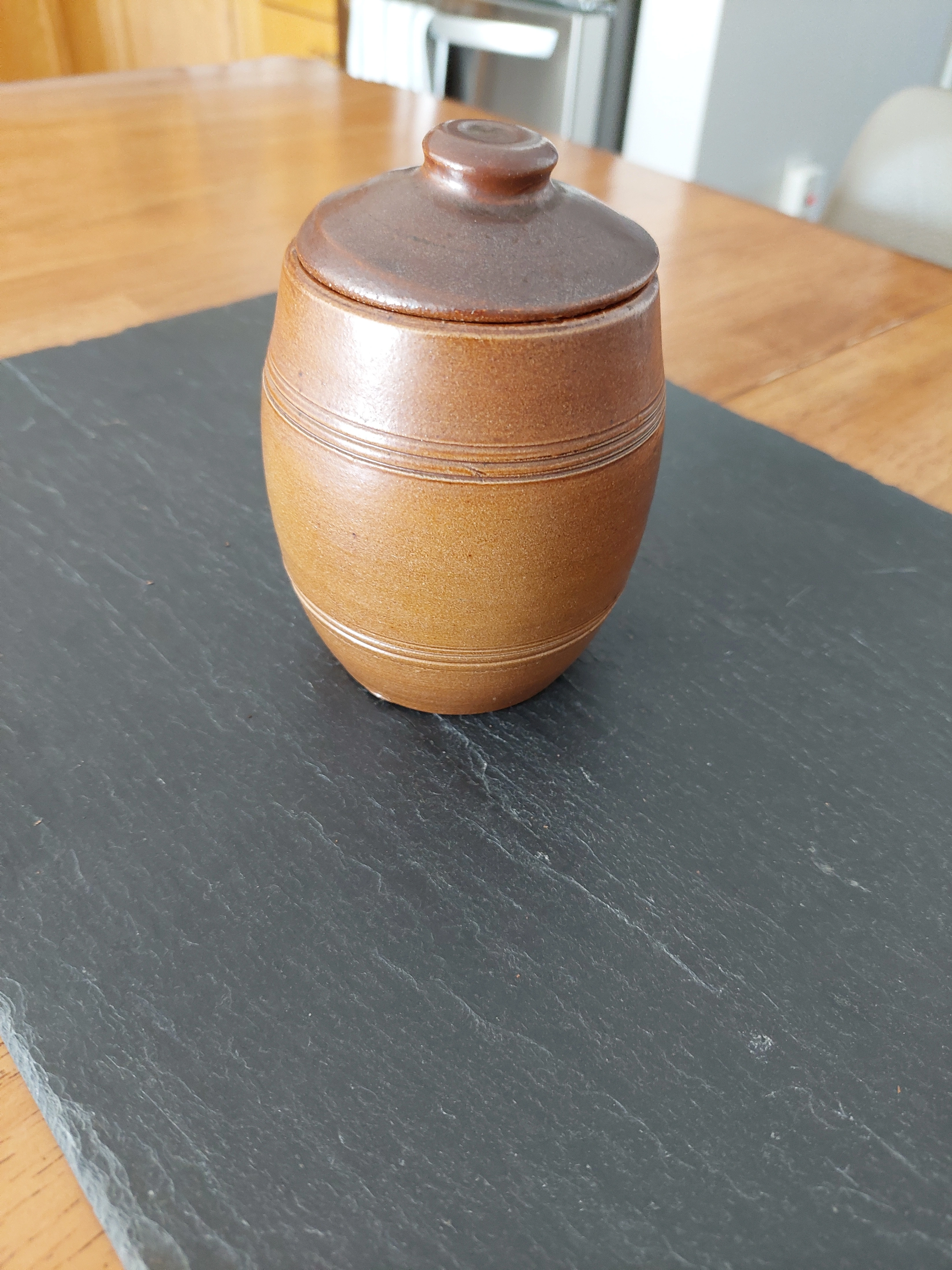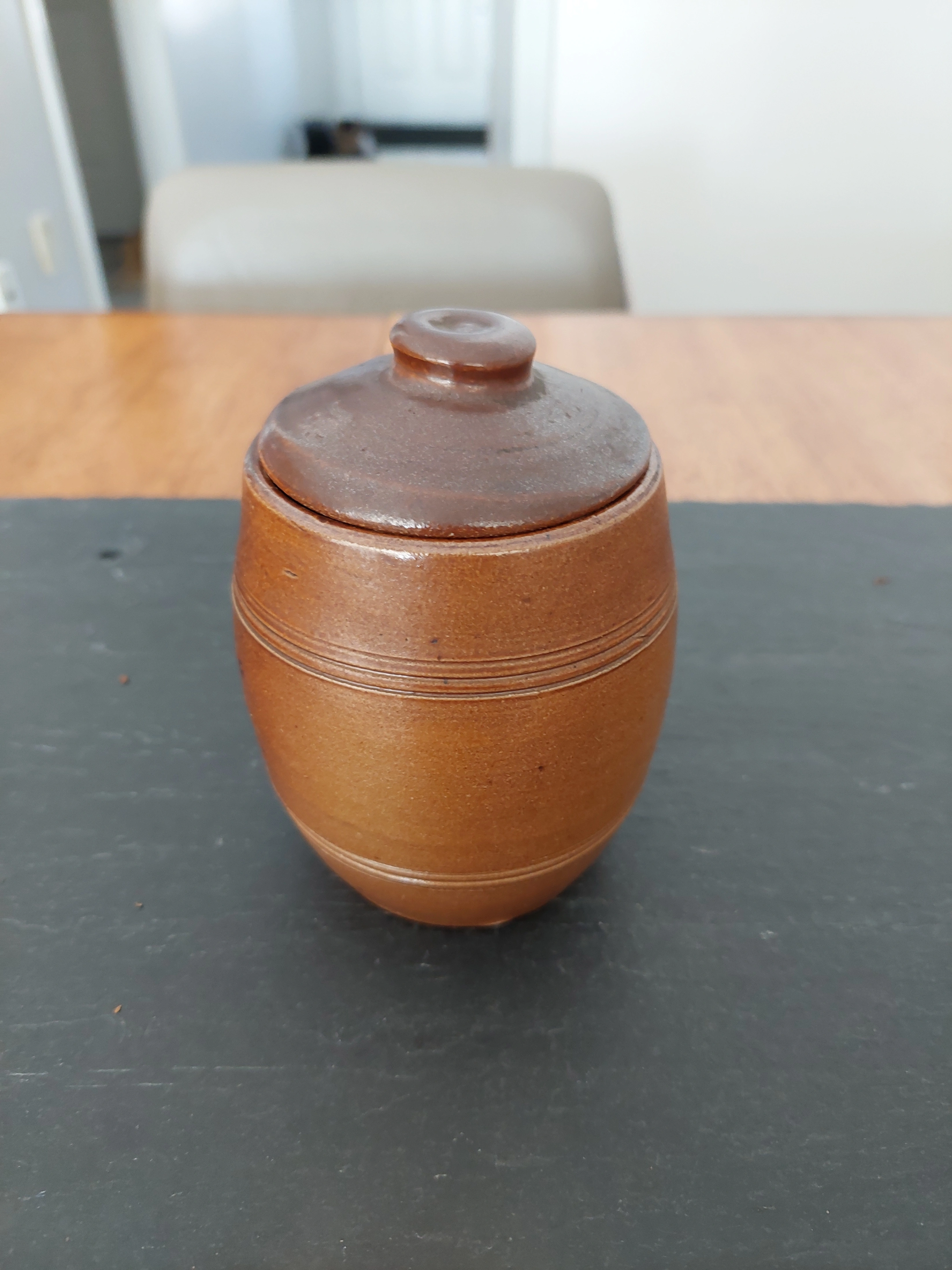 Selling a cute brown condiments ceramic jar with a lid. It's in great shape and would be perfect for storing small items or adding a rustic touch to your decor. Wood-fired glaze.