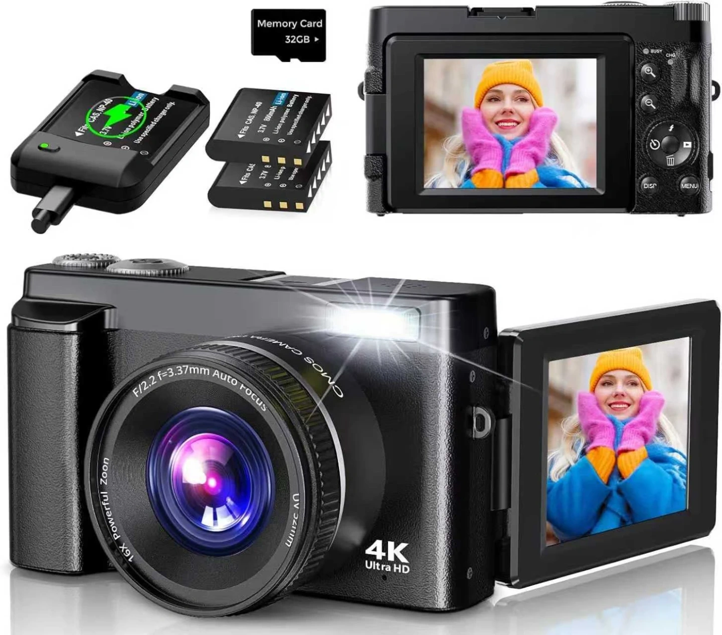 This 4K Ultra HD digital camera offers 16x powerful zoom and autofocus. It comes with two NP-40 Li-ion batteries, a charger, and a 32GB memory card. The flip-up screen makes selfies and vlogging easy!