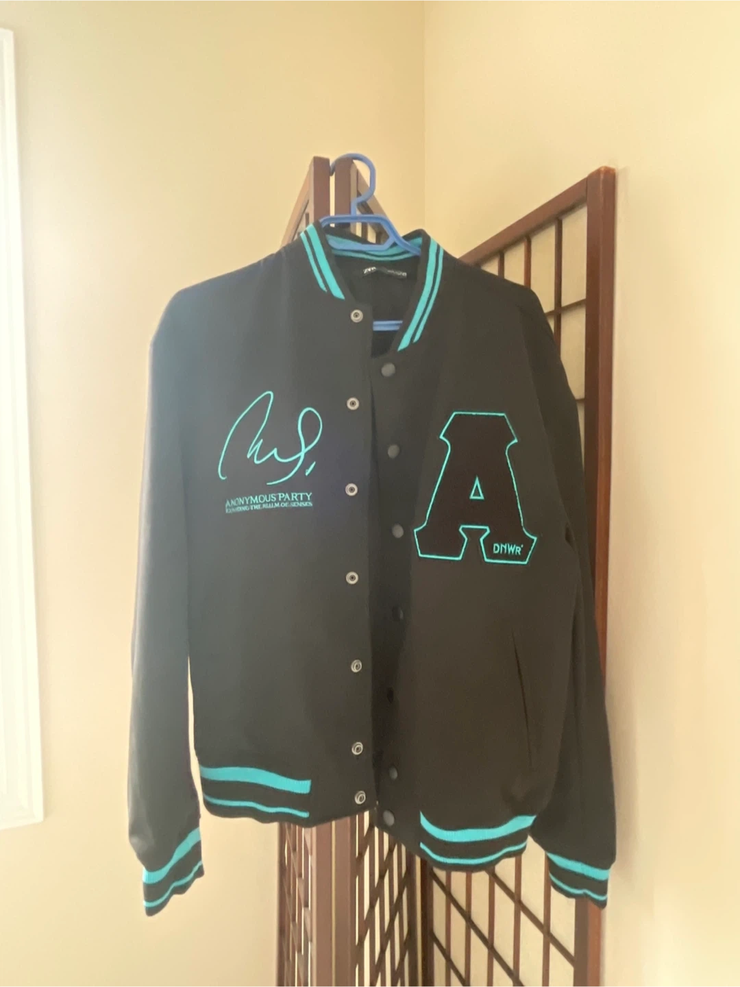Black varsity bomber jacket from Zara. Features teal accents and ribbed cuffs and hem. Size medium.