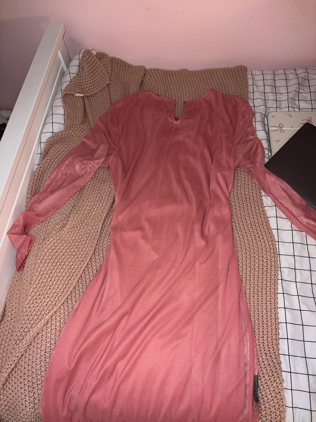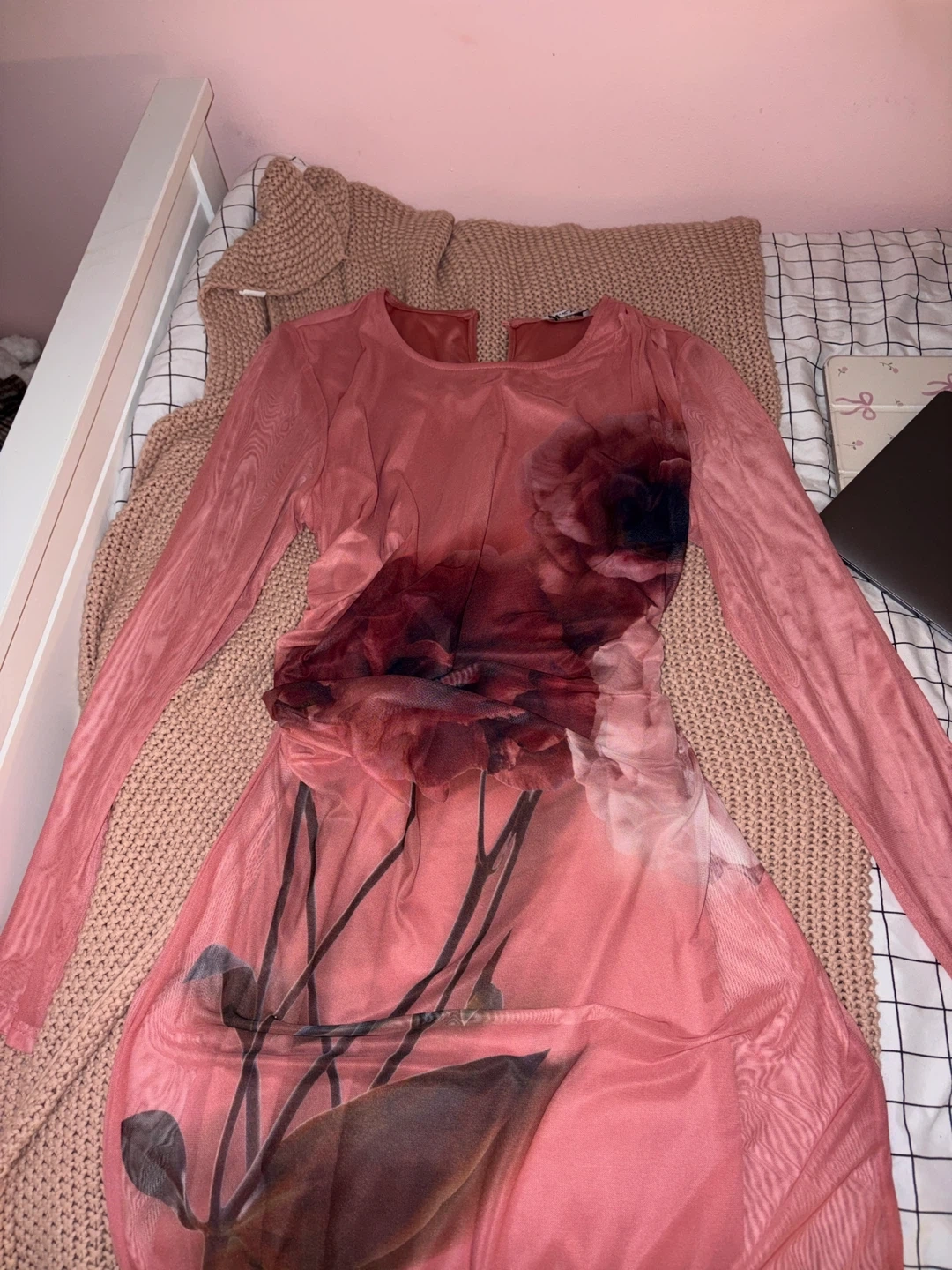 Sheer long-sleeve dress in a lovely pink hue. Features a striking floral print across the bodice and skirt. It's a unique piece for any occasion. The material is lightweight mesh.