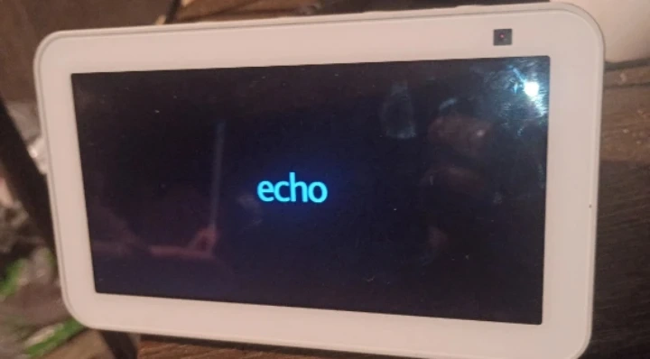 This is an Amazon Echo Show 8 smart display. It's white and has a touchscreen. Includes Amazon power adapter.