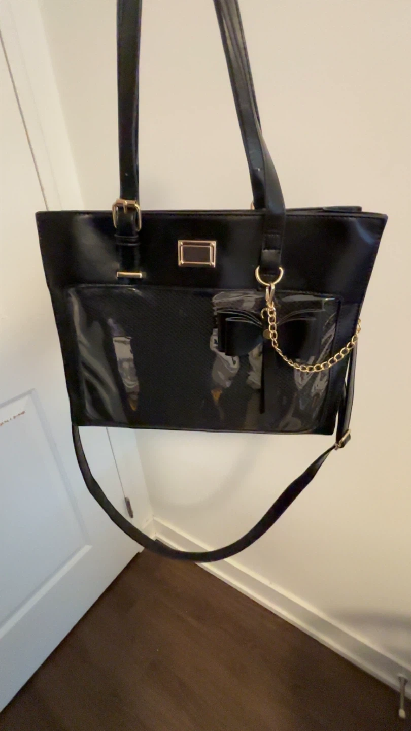 This black tote bag features a stylish clear window panel on the front. It includes a decorative bow and a detachable gold chain accent. The bag has a smooth finish and comes with both top handles and a removable shoulder strap.