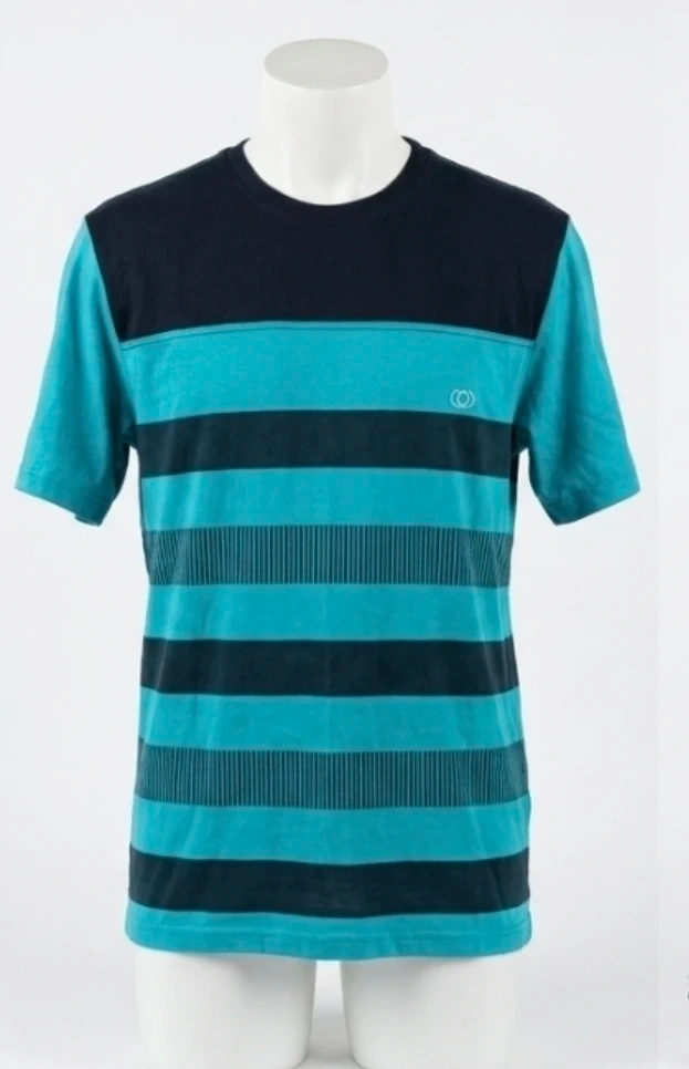 This is an O'Quinn ocean blue t-shirt, black stripes. 100% cotton