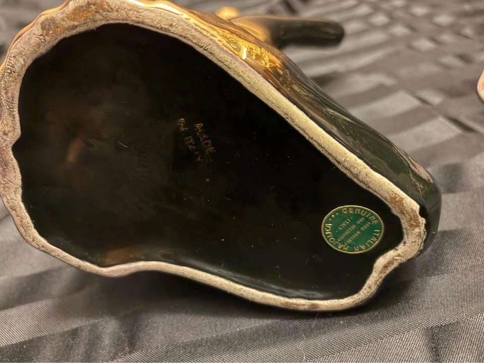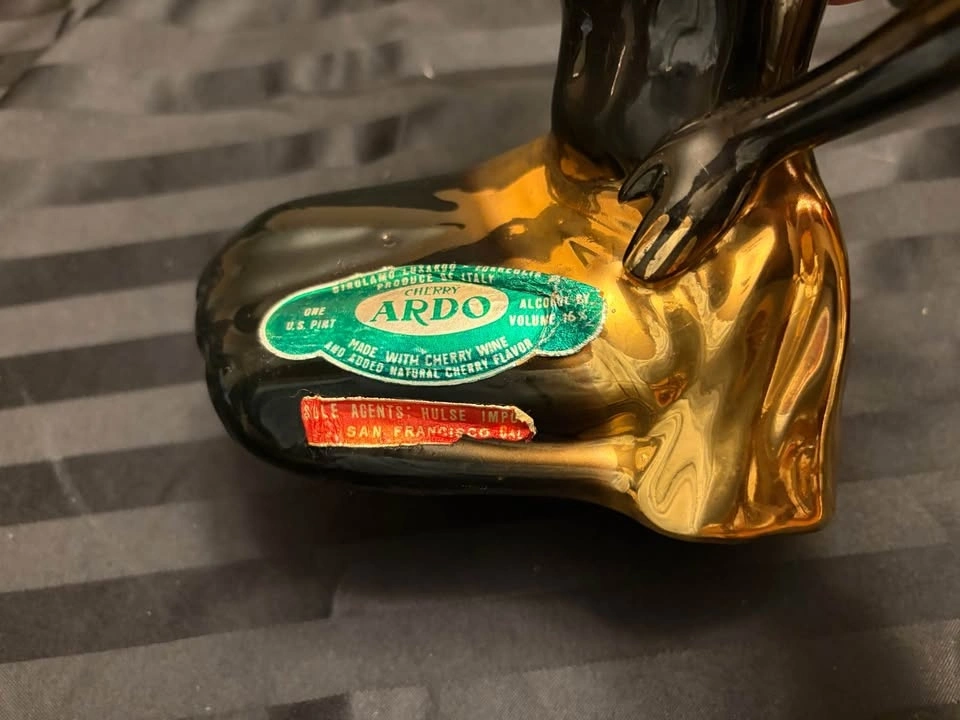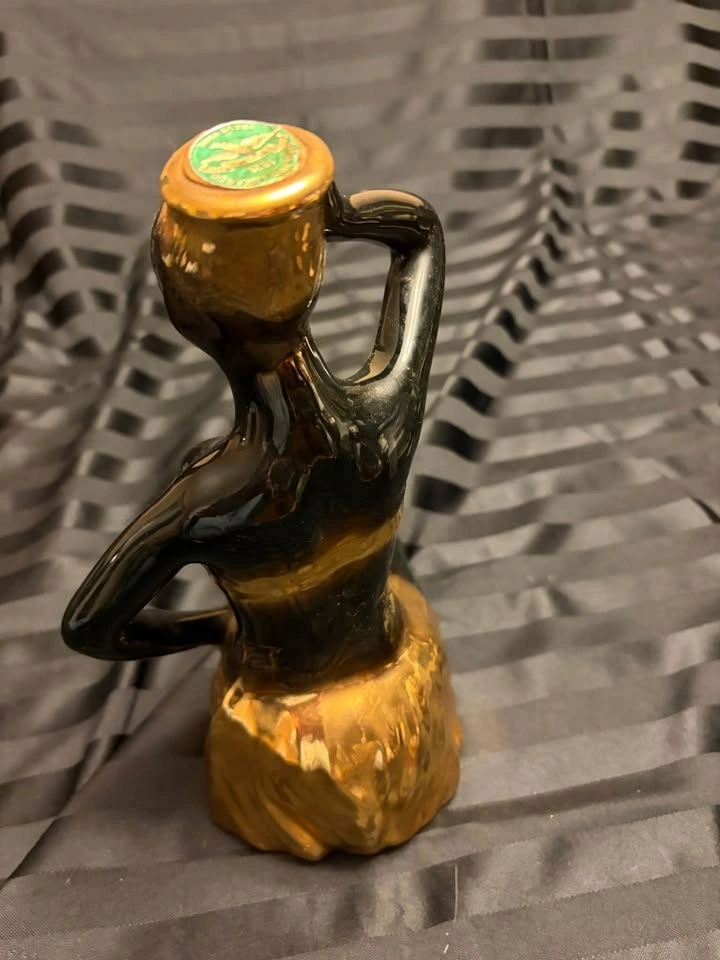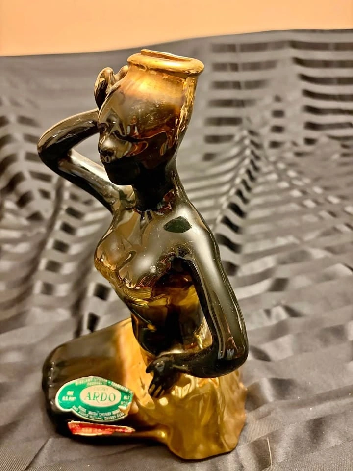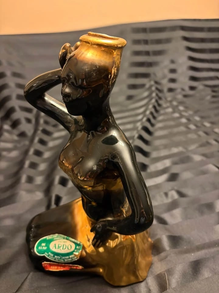 1960s sealed Luxardo Cherry Ardo liquor bottle in the shape of a kneeling woman. The bottle was designed to hold a limited amount of Cherry Ardo Italian Natural Cherry Wine Liqueur and was produced in various figural shapes, including this "African Lady" style. The bottle is made of ceramic. There has been much evaporation over the years as the bottle no longer feels full.