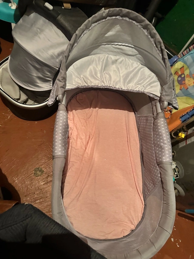 This is a used rocking bassinet, perfect for soothing your little one to sleep with its gentle rocking motion. The bassinet is in good condition and ready for a new home. It features a cozy sleeping area and a sturdy frame for safety. This rocking bassinet has been a lifesaver, creating a serene environment for my baby to drift off to dreamland. However, it's time for it to bring comfort to another family. $65 OBO.