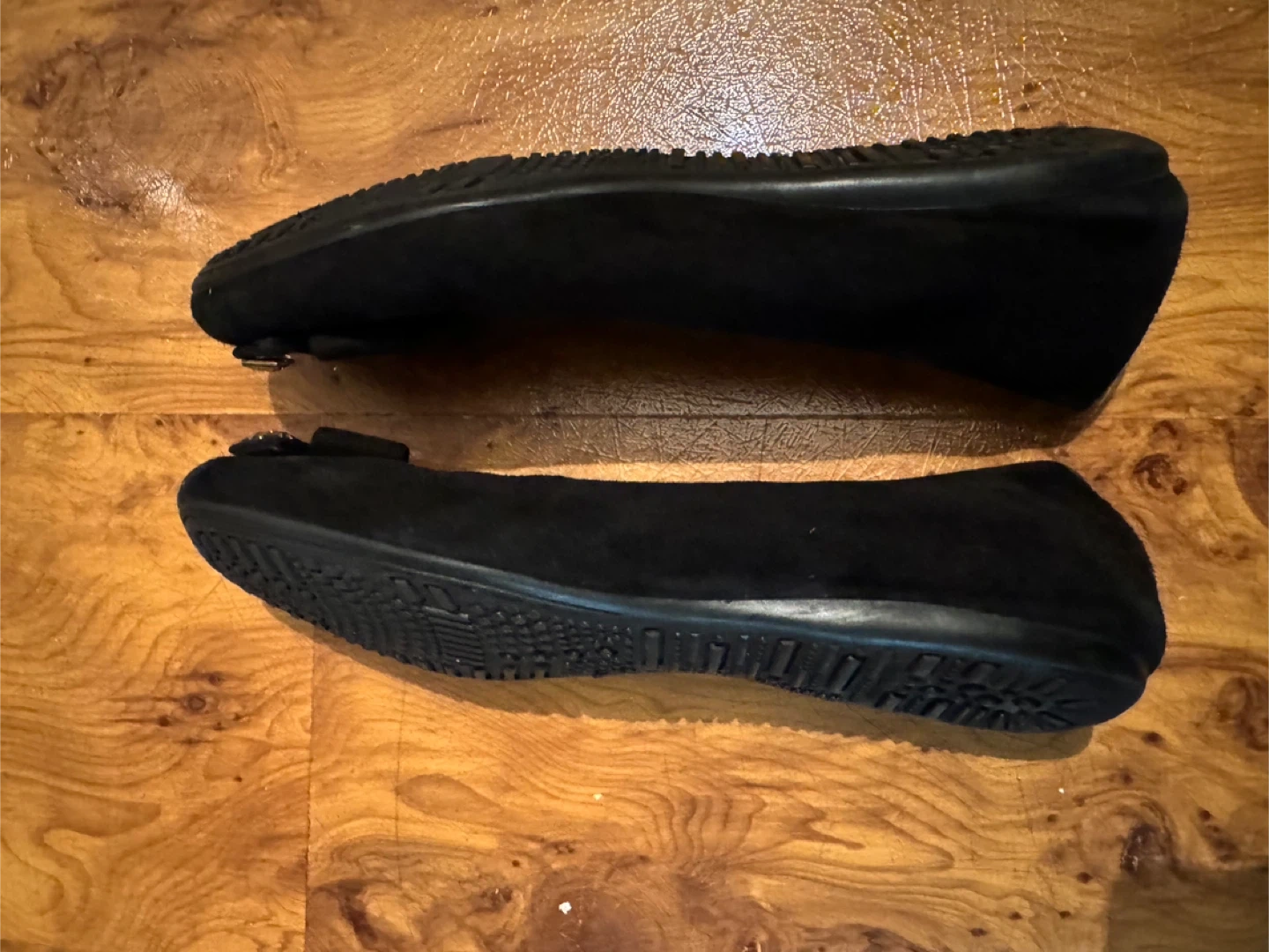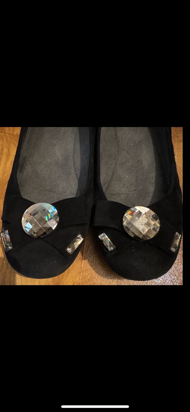Chic black suede ballet flats from Stuart Weitzman. They feature a decorative bow accent with sparkling embellishments on the toe. Comfortable for everyday wear or dressed up for an evening out! Size 7.5-8