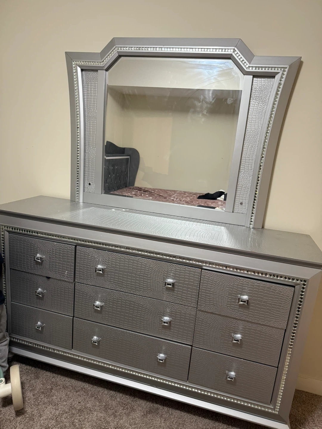Silver dresser with mirror and nine drawers. It's made with a textured faux crocodile finish and rhinestone trim. Includes stylish chrome handles.