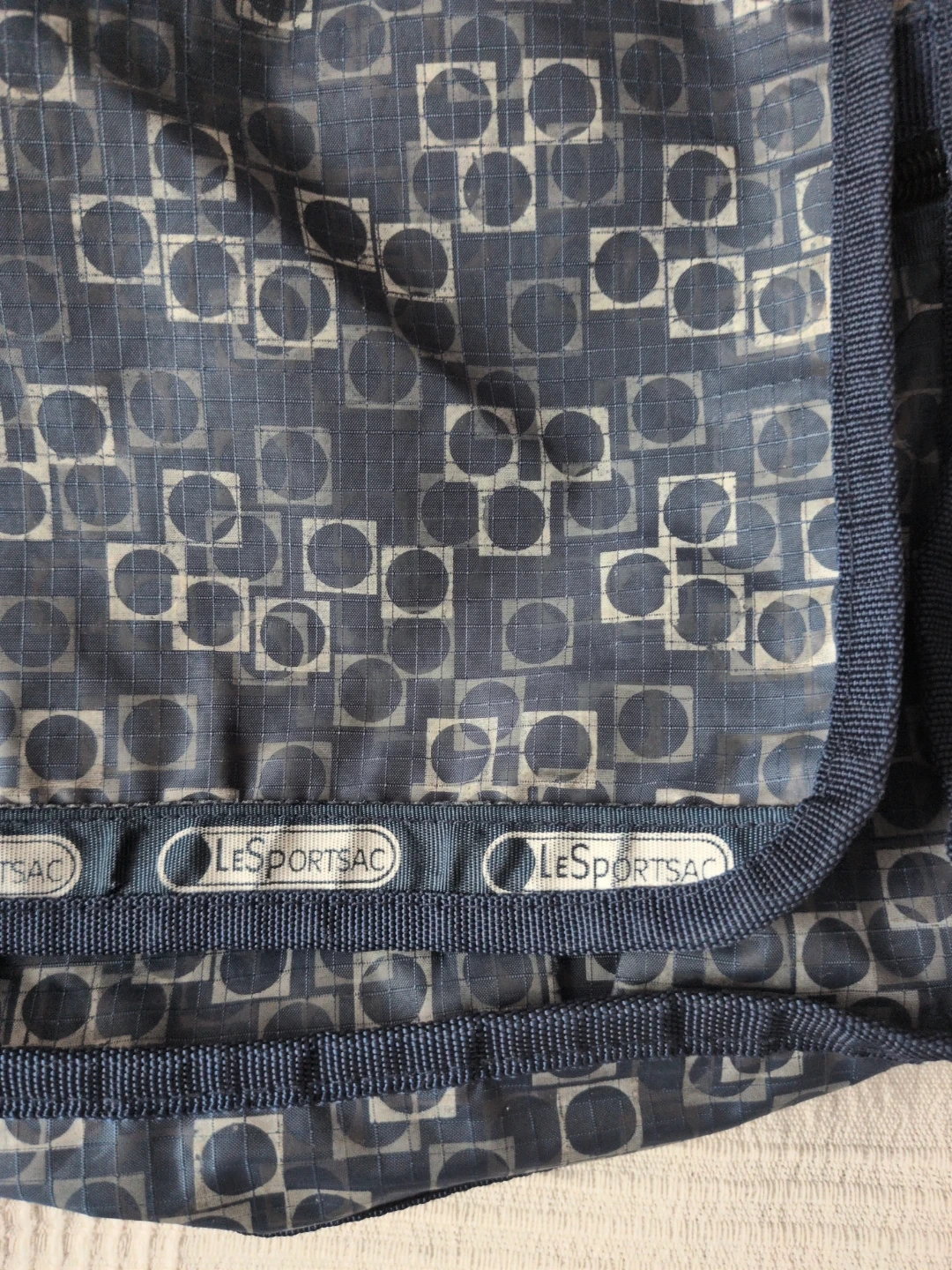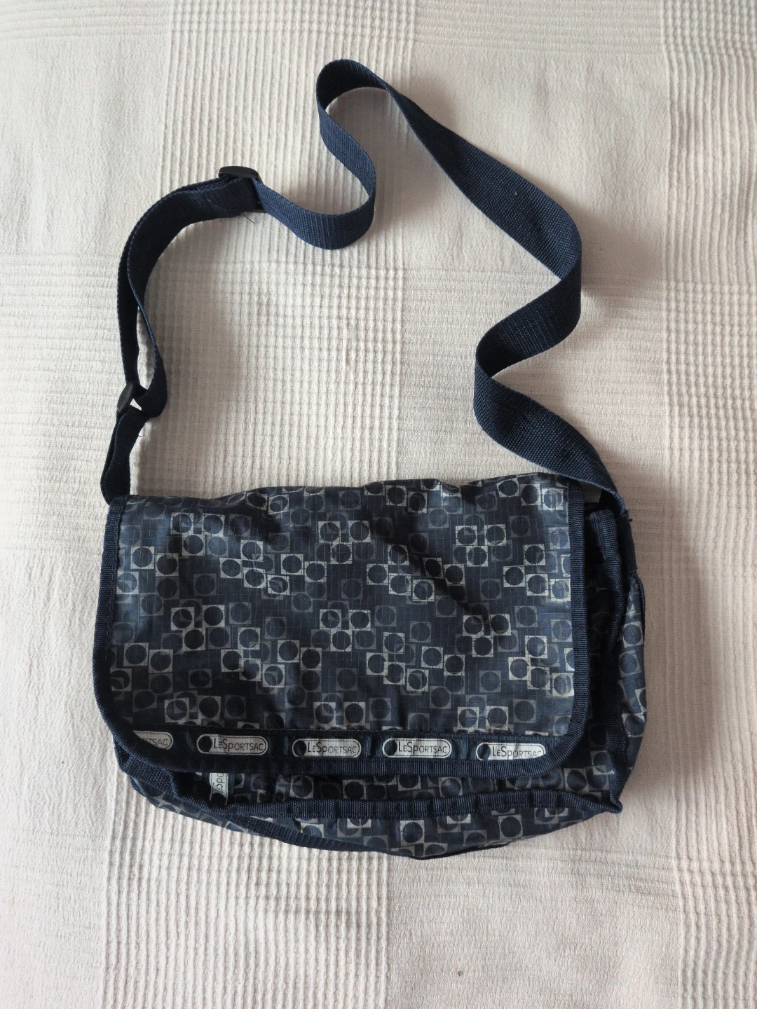 LeSportsac messenger bag in a blue geometric pattern. It's made of durable nylon and features an adjustable strap. Perfect for everyday use!