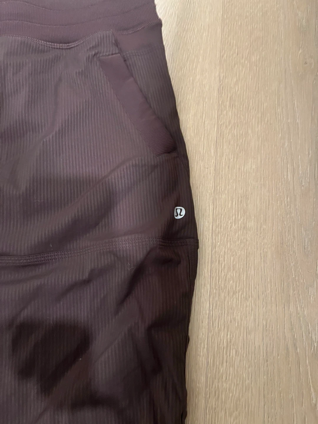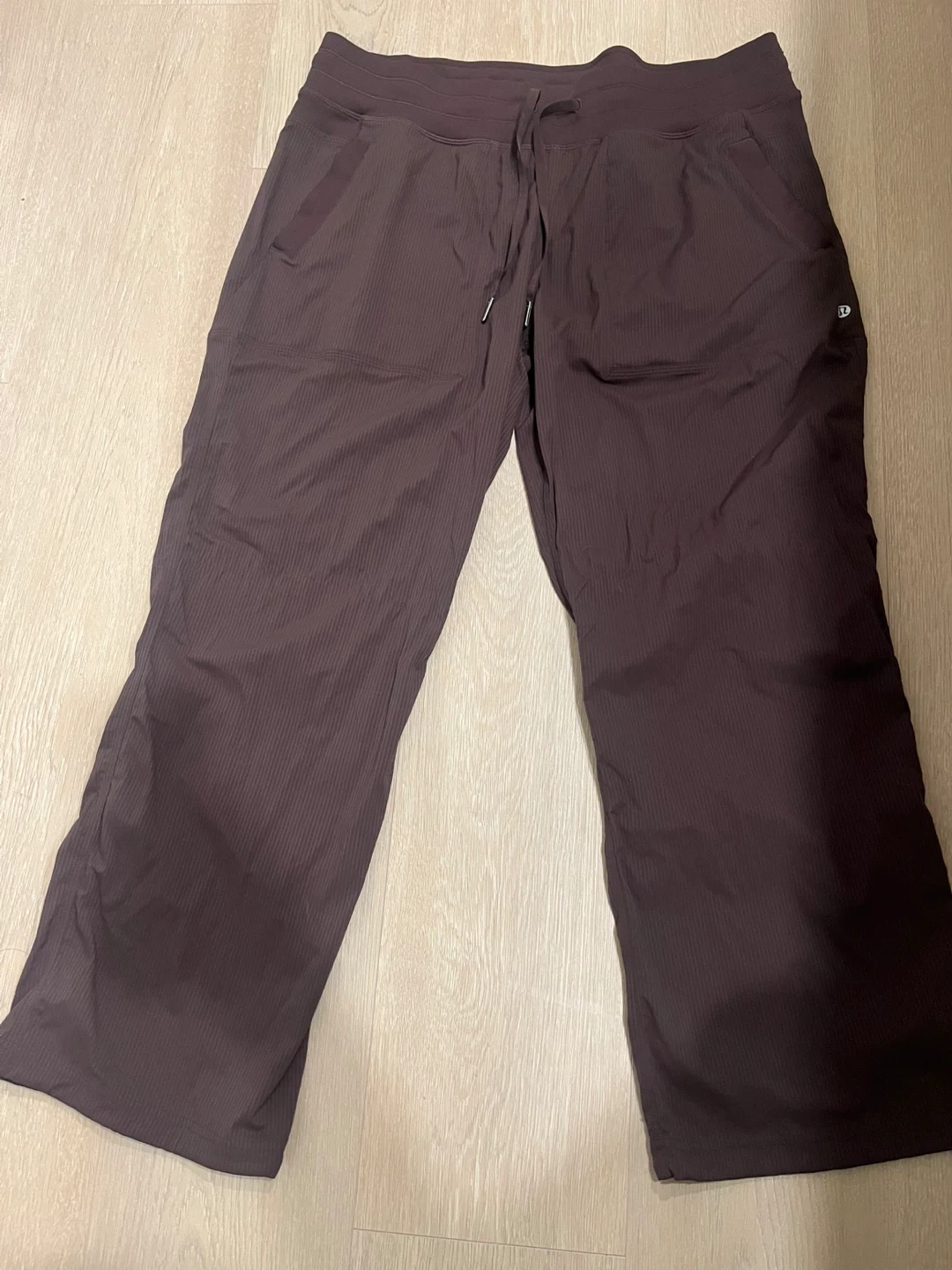 Brown Lululemon athletic pants with a subtle pinstripe pattern. These pants feature a drawstring waist and are made for comfort during workouts. They're a capri length and have two side pockets. Size 14