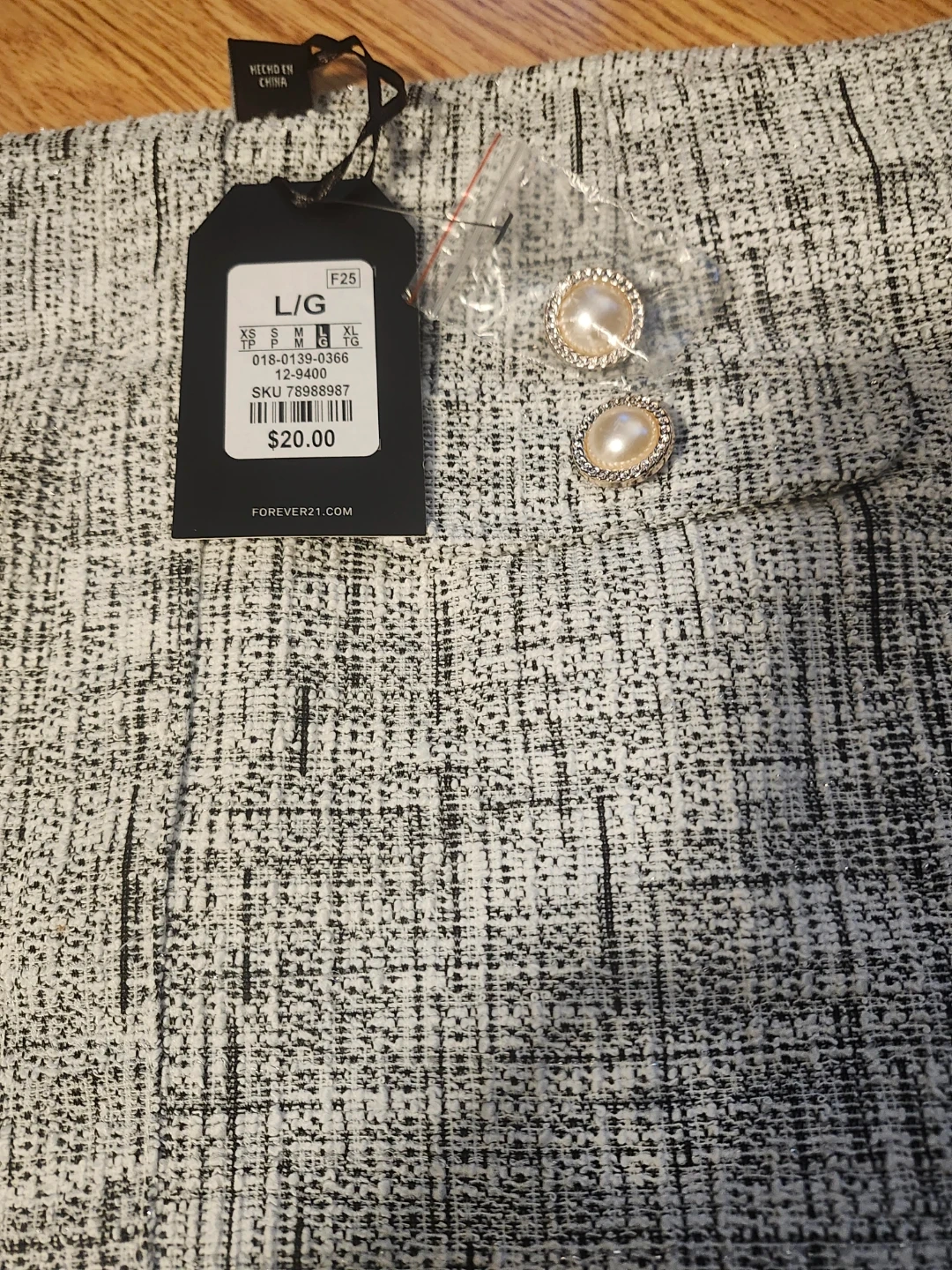 This is a Forever 21 tweed mini skirt. It's black and white with decorative pearl and gold button details. Includes two extra button in a sealed bag.