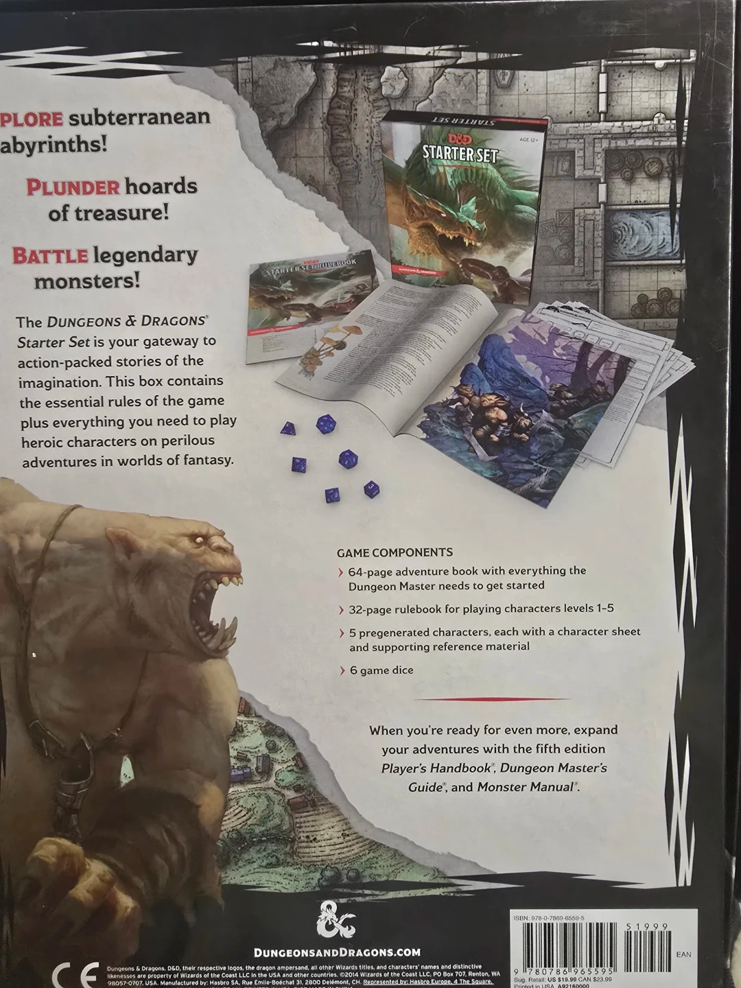 This Dungeons & Dragons Starter Set is your gateway to action-packed stories of imagination. It contains the essential rules to play and everything you need to begin your adventures. Includes a 64-page adventure book, 32-page rulebook for levels 1-5, 5 pre-generated characters, and 6 dice.