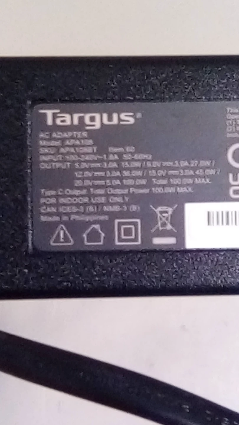 Targus 100W USB-C power adapter with a 6-foot cable. Supports 5V/3A, 9V/3A, 15V/3A, and 20V/5A output. Maximum output power 100W. For indoor use only. Includes a Velcro strap.