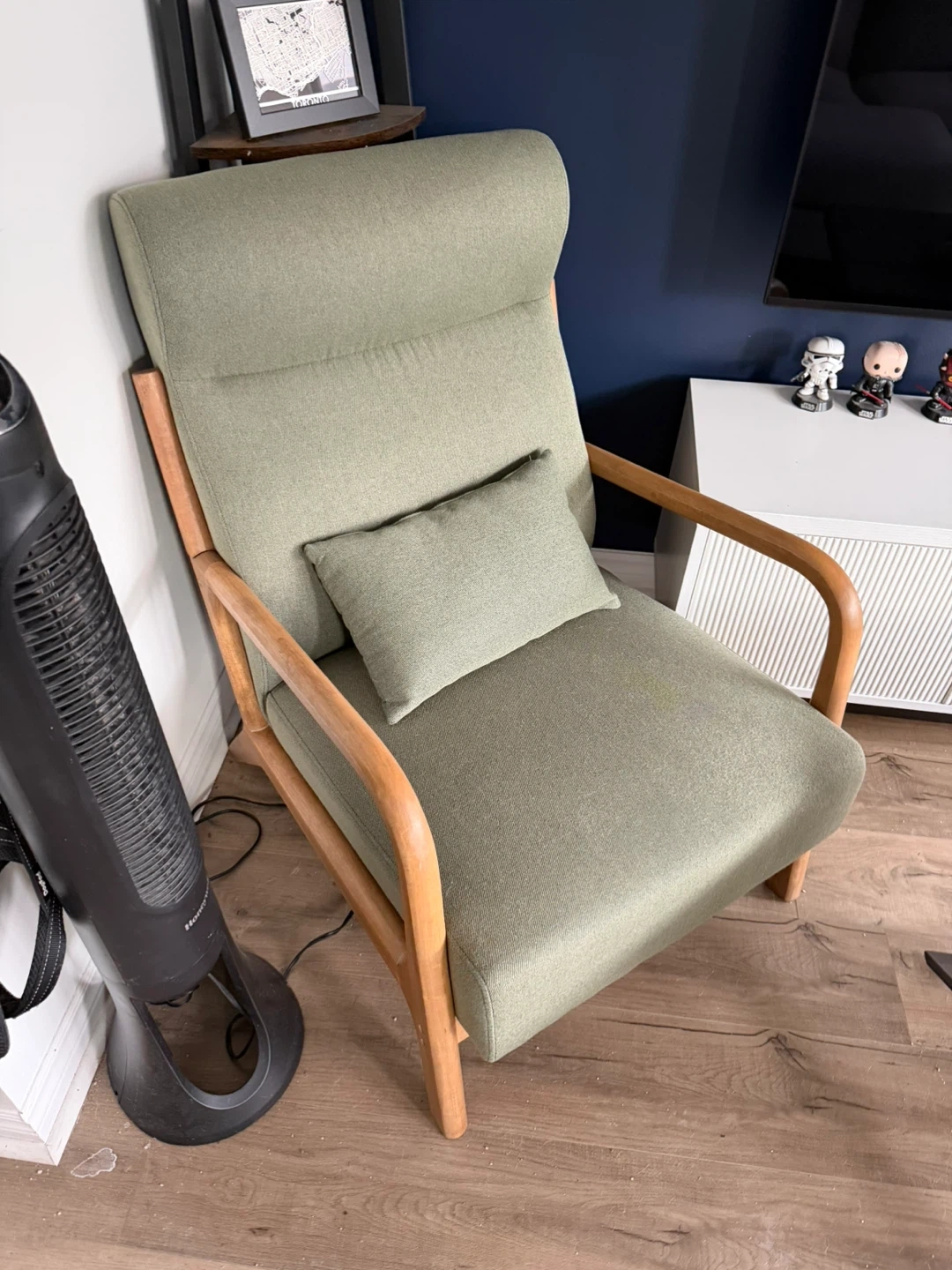This comfortable accent chair features a light green upholstery and a natural wood frame. It comes with a matching lumbar pillow for added support. Its clean lines make it a stylish addition to any living space.