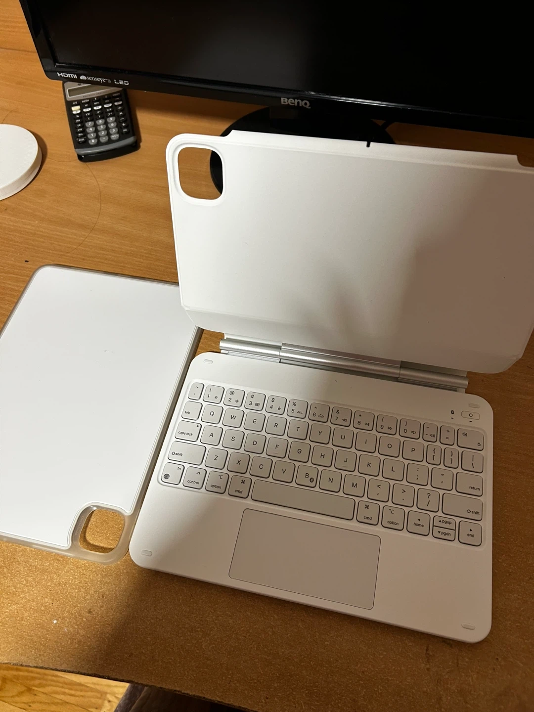 White Keyboard for iPad Pro. It's a full-size keyboard with a trackpad and USB-C passthrough charging. It also has a protective case for your iPad. Works with iPad Pro 12.9”