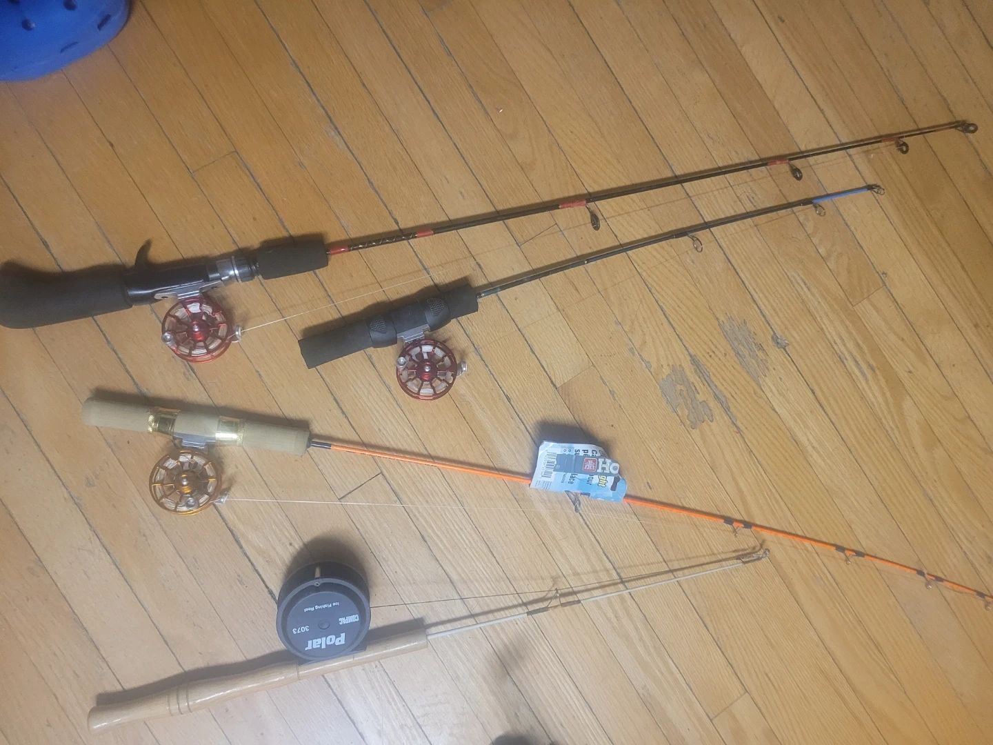 Includes four fishing rods and four reels. One reel is a Polar brand 3073 ice fishing reel. Various sizes and styles are included.