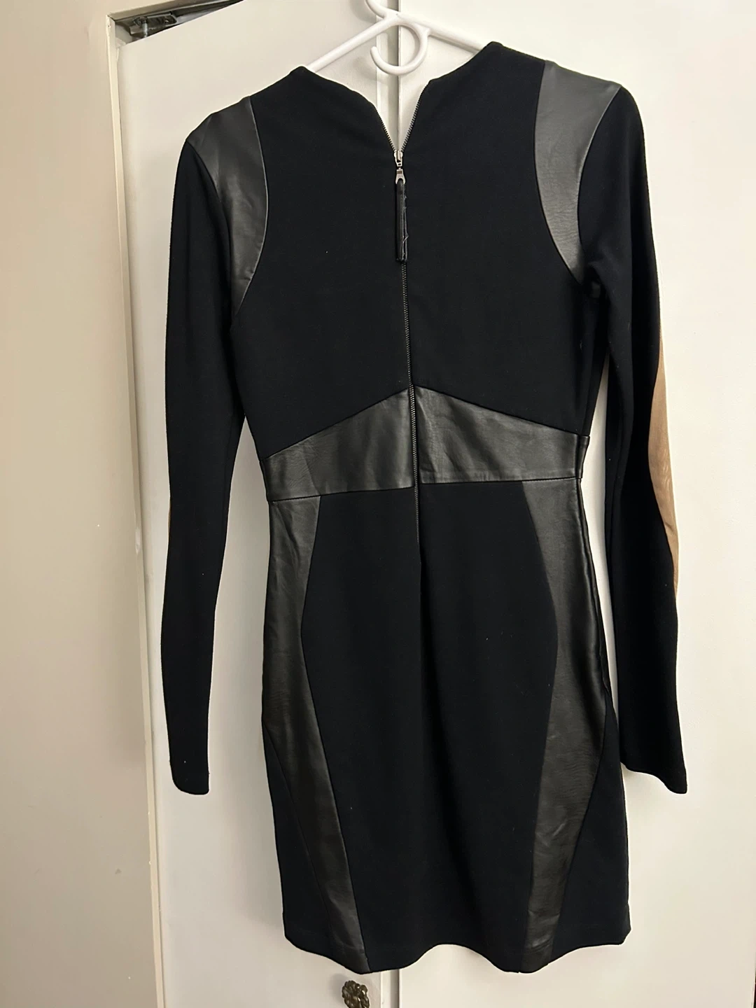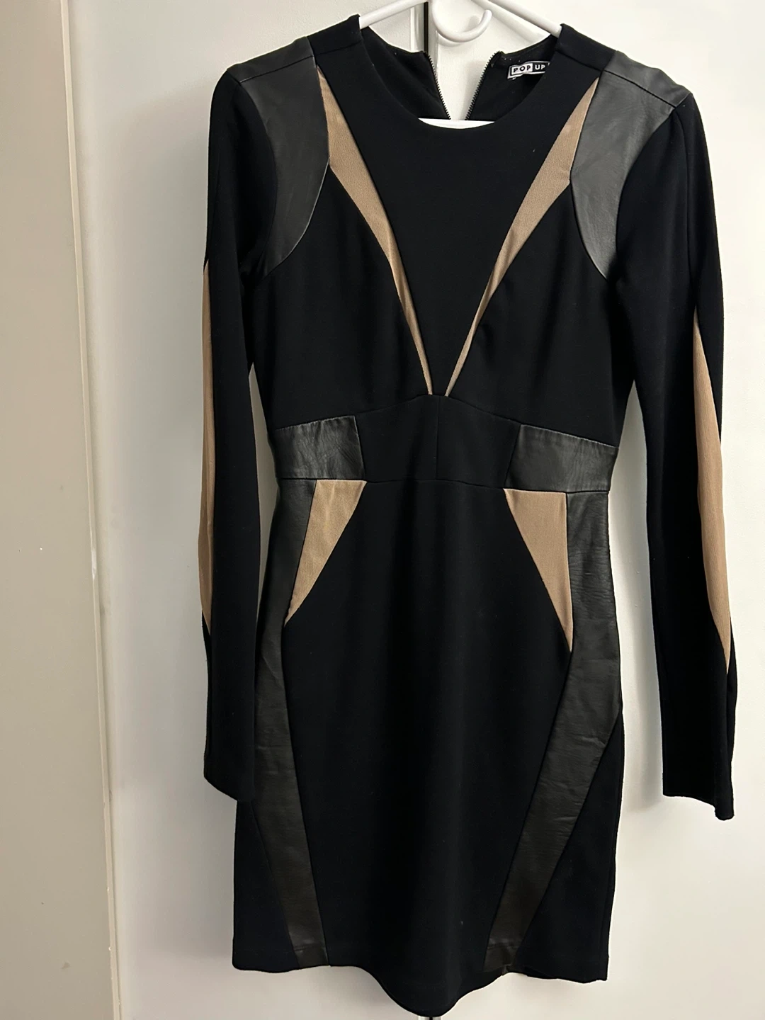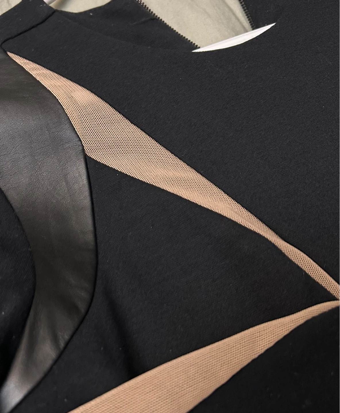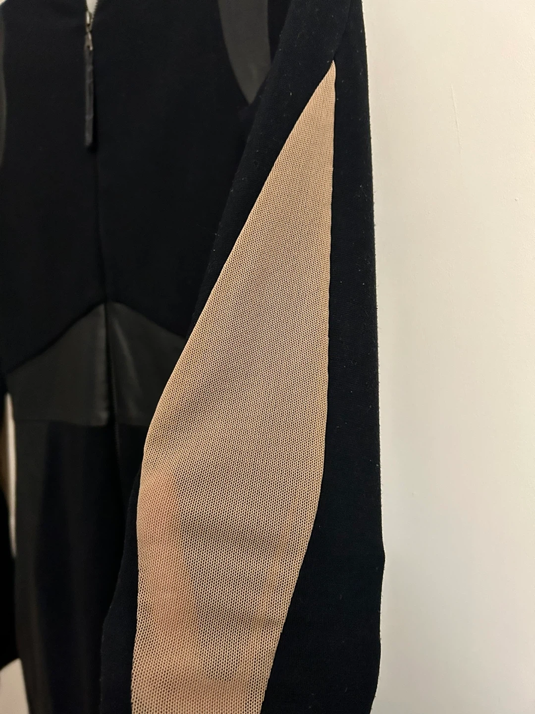 Beautiful black base with contrasting nude mesh and faux leather panelling. It's a size 38 with long sleeves and a zip closure at the back. This unique dress is sure to make a statement! I love this dress. But doesn’t fit me anymore.