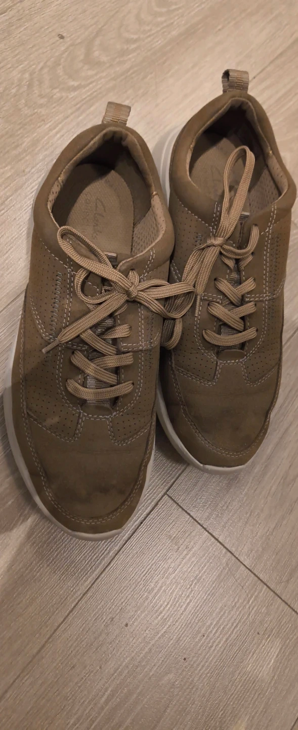 These brown Clarks sneakers are made with suede and feature a lace-up closure. They have a stylish perforated design and a comfortable fit. Perfect for casual wear!