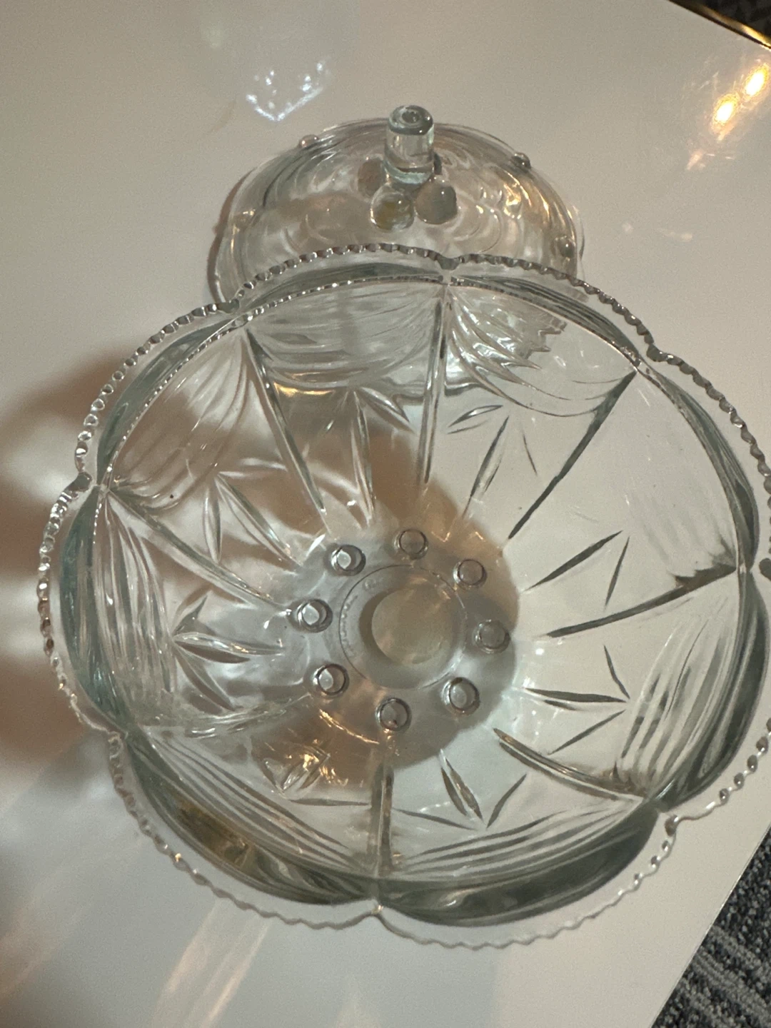 Selling a beautiful vintage clear glass candy dish with a lid. It has a lovely decorative pattern and would be perfect for displaying candies or other small treats. It's in great condition and ready to add a touch of elegance to your home!