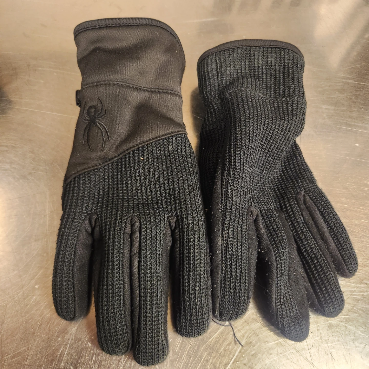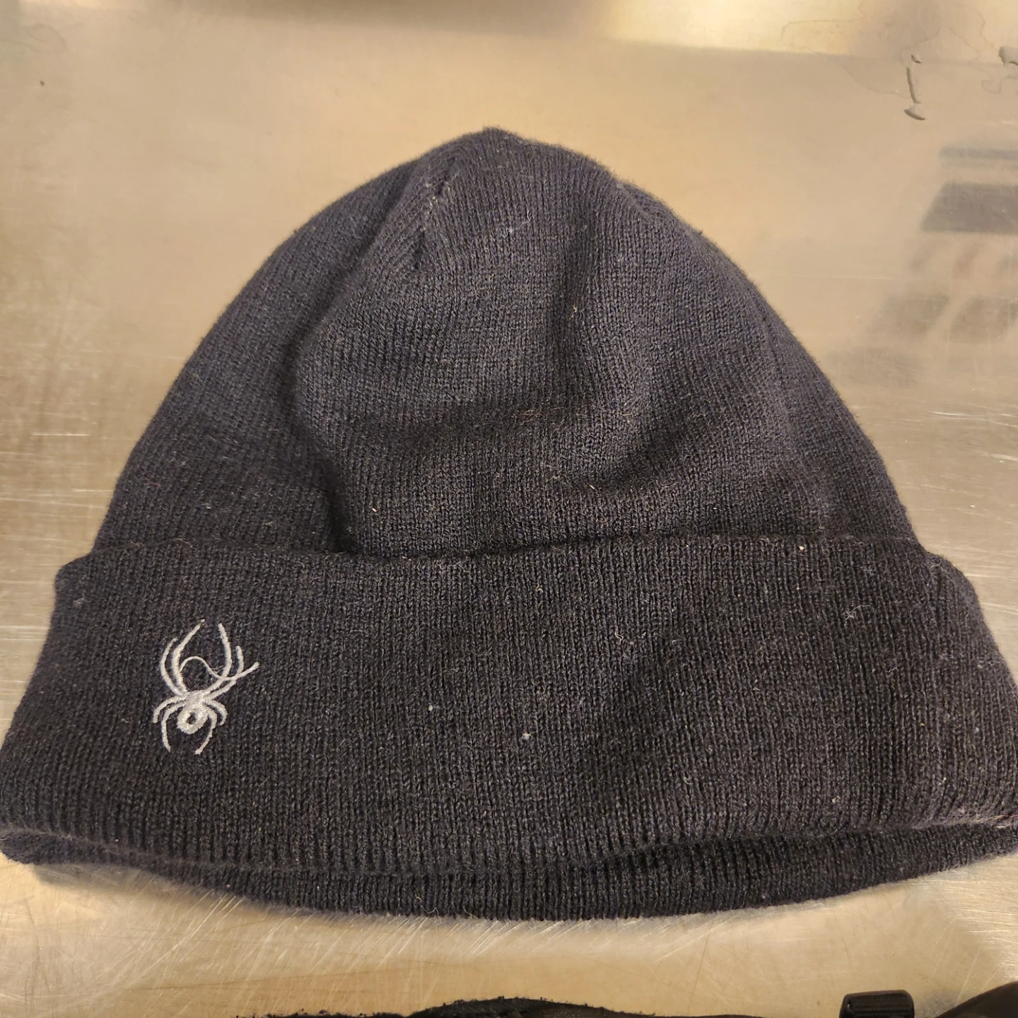 πŸ₯• This is a set of black Spyder gloves and a matching beanie. The gloves feature a textured palm for grip and a knitted back. The beanie is made of a knitted material. The thumb on the left hand glove needs sticking but you can wear it as it is too.