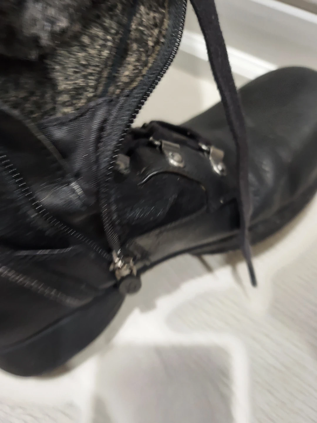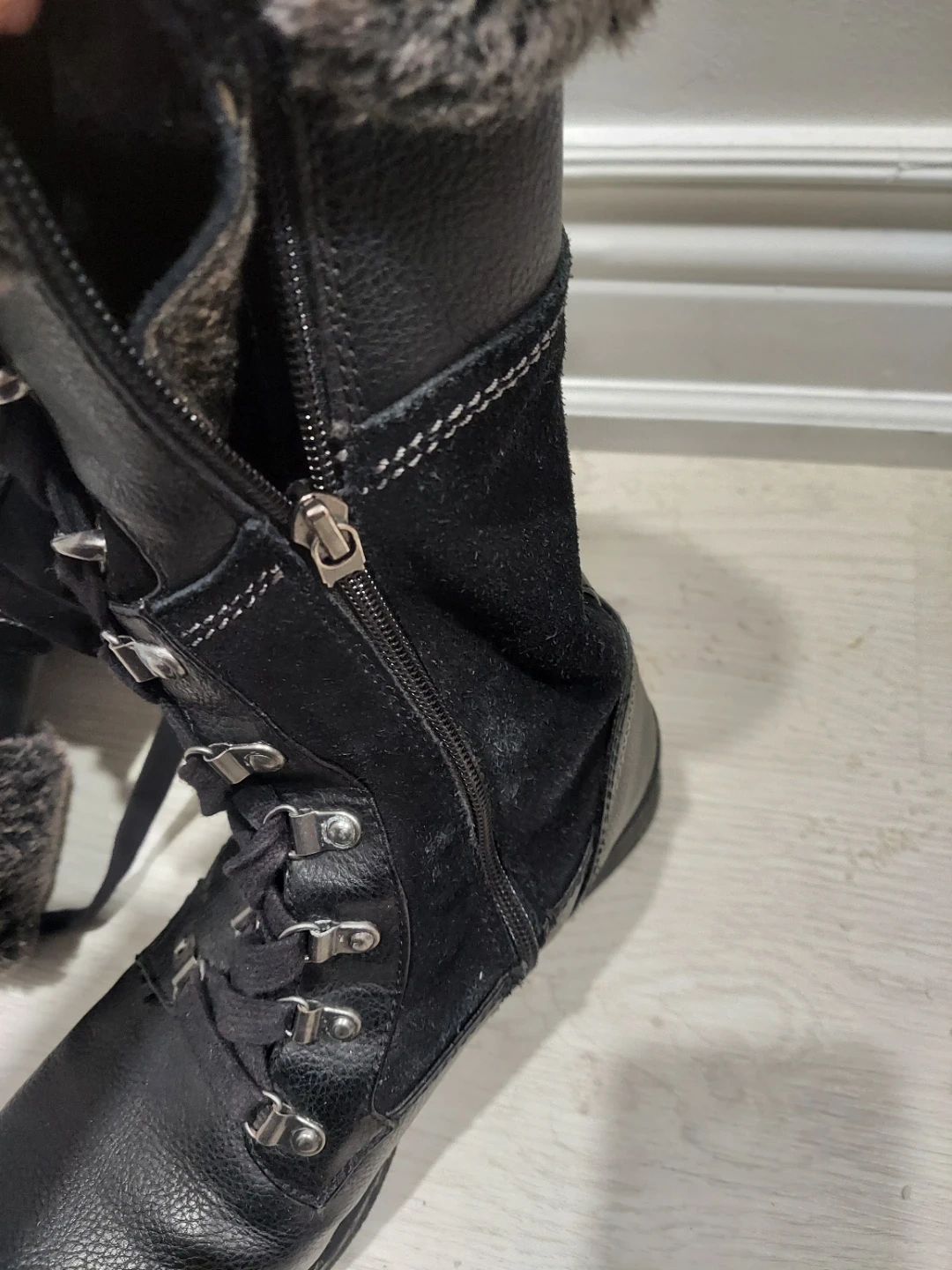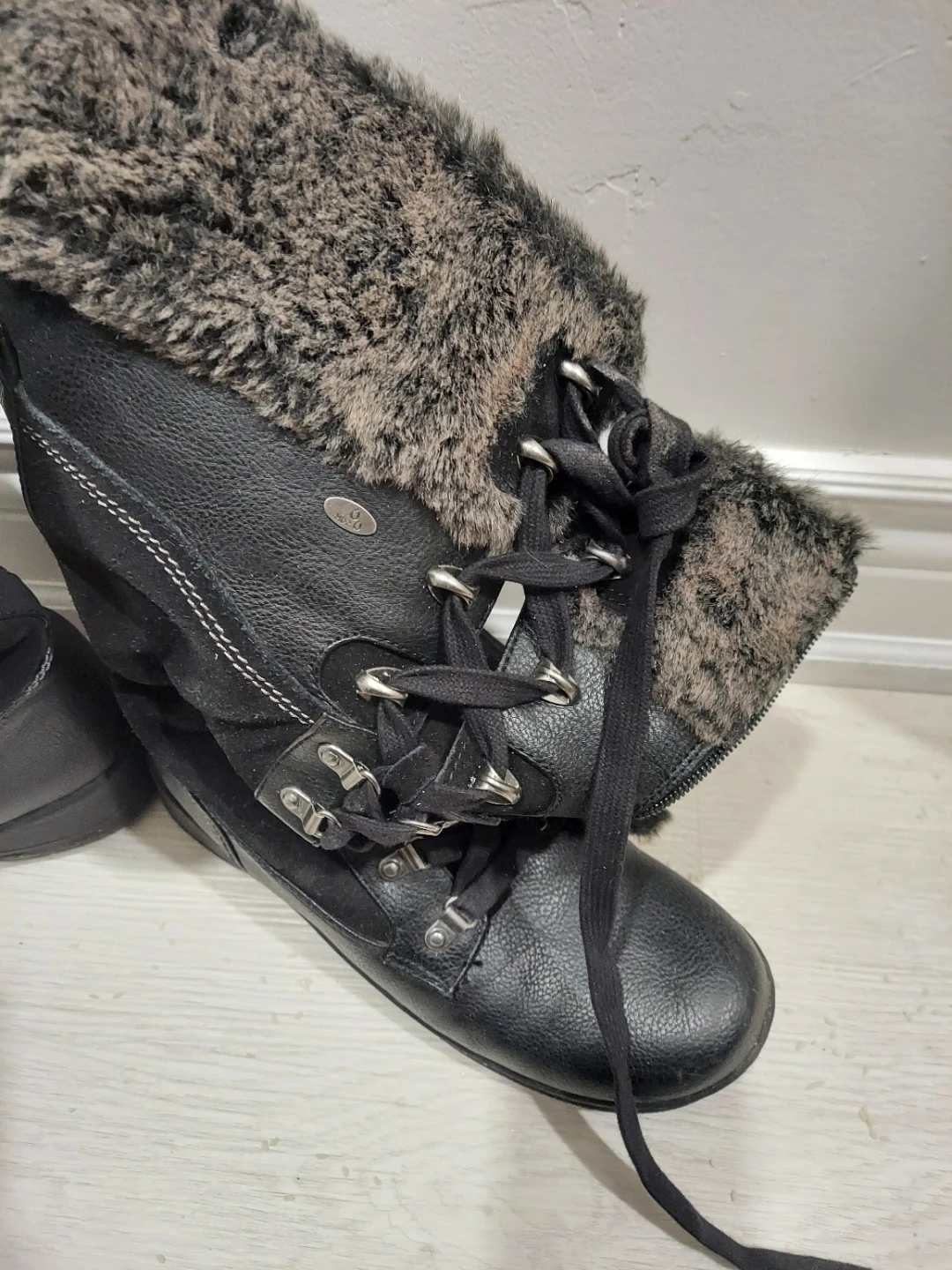Comfortable black winter boots with faux fur trim. These boots feature a side zipper and lace-up front for a secure fit. Perfect for keeping your feet warm and dry during colder months!