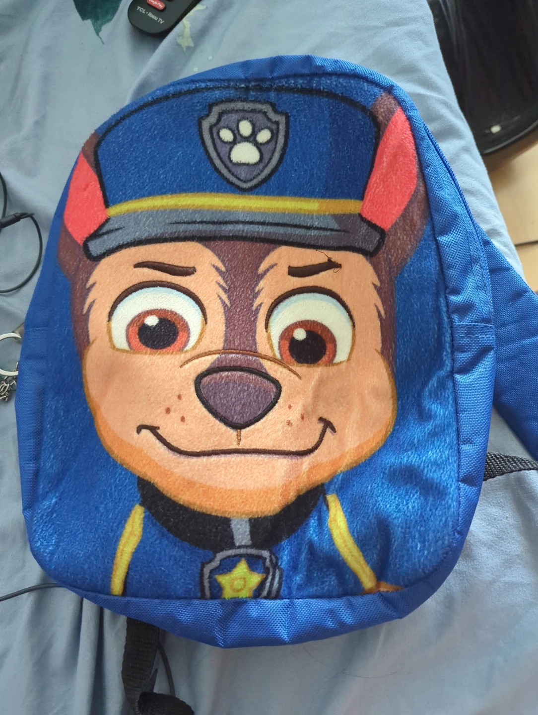 This bright blue Paw Patrol backpack features Chase on the front. It's made of durable fabric with adjustable straps. Perfect for little ones heading to school or on adventures!