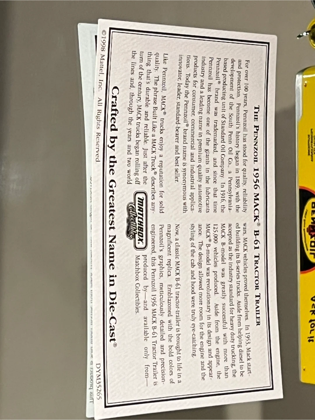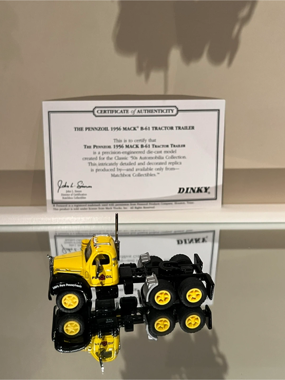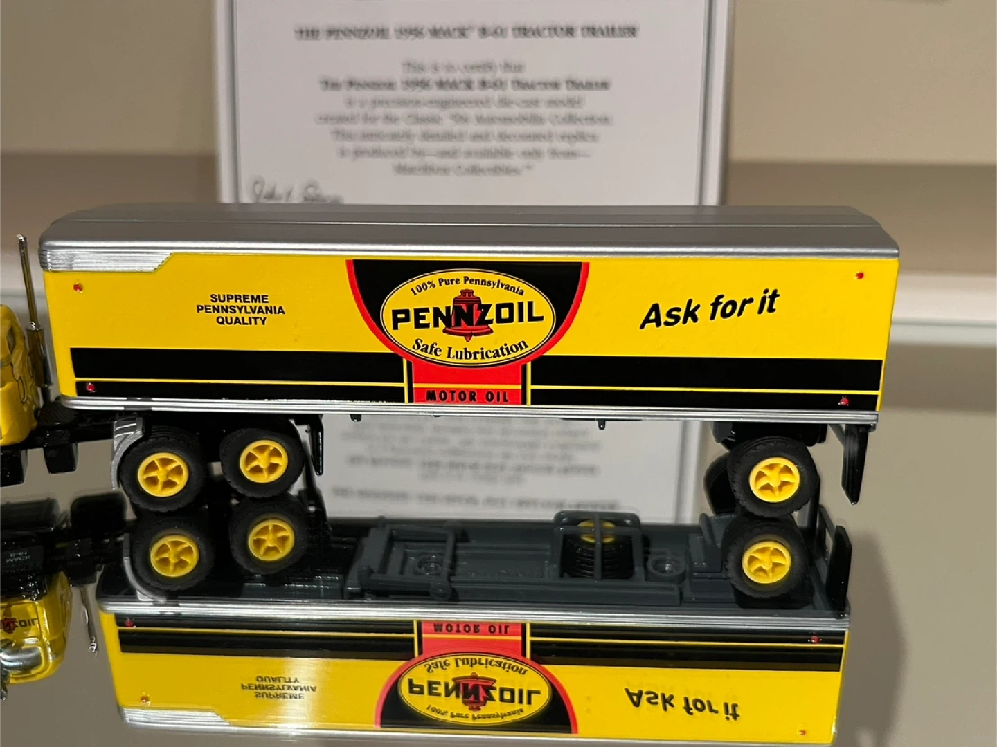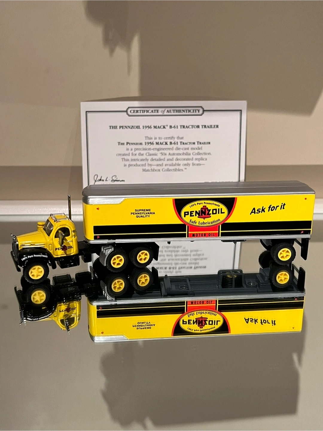 This is a NEW die-cast model replica of the Pennzoil 1956 Mack B61 tractor trailer. It's detailed with yellow, black, and silver colouring, and features the Pennzoil logo and branding. Includes a certificate of authenticity.