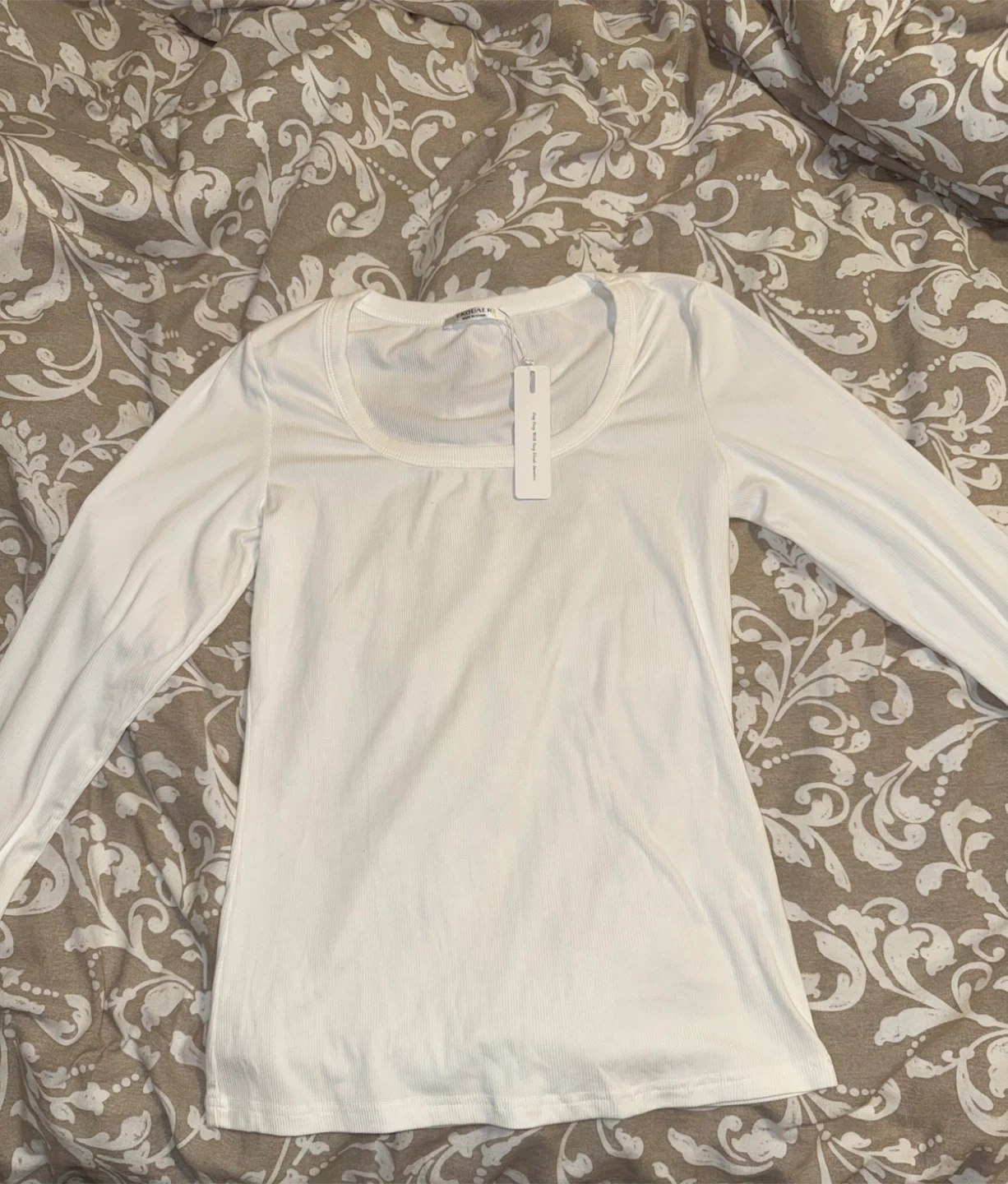 Simple white ribbed long sleeve top. It's made of a comfortable stretch fabric. This top is great for layering or wearing on its own! Never worn, its tag is still attached.
