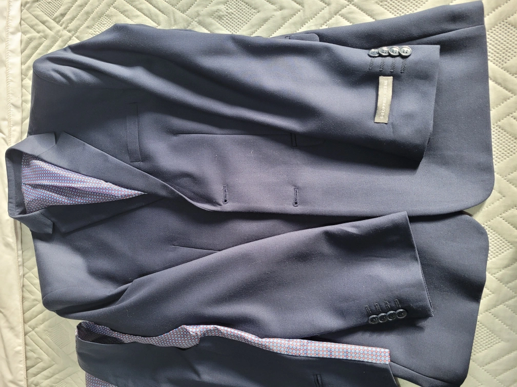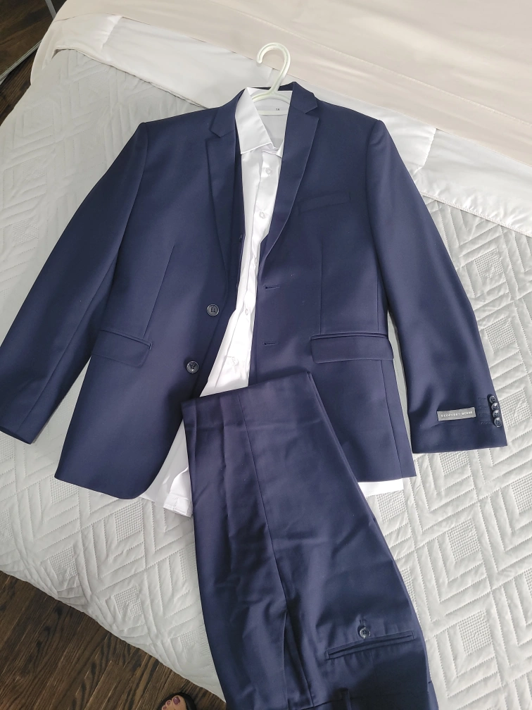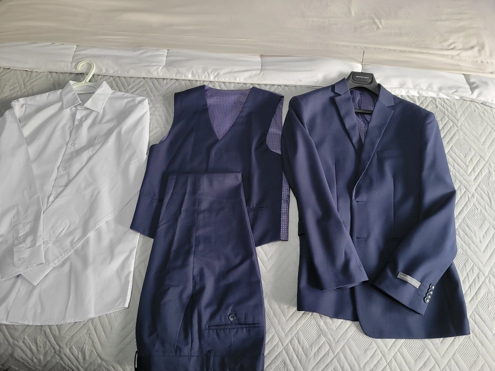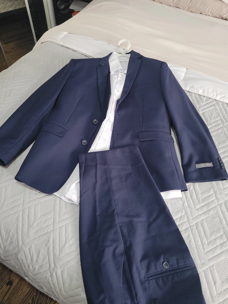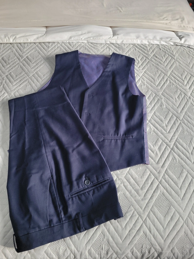 Selling a youth's navy blue suit that includes the vest and shirt! Comes in a suit bag for easy transport and storage. Perfect for any formal occasion
