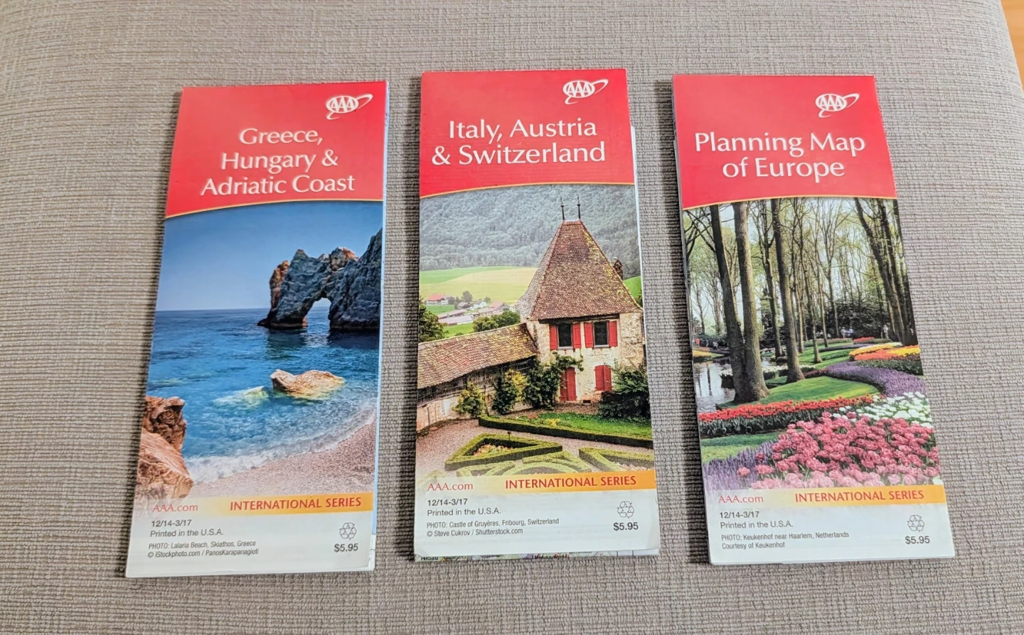 Trading three AAA International Series travel maps: Greece, Hungary & Adriatic Coast; Italy, Austria & Switzerland; and Planning Map of Europe. Printed in the U.S.A. and dated 12/14-3/17.