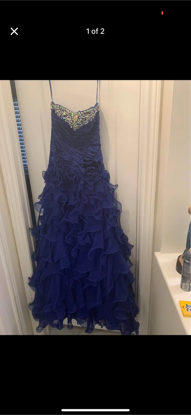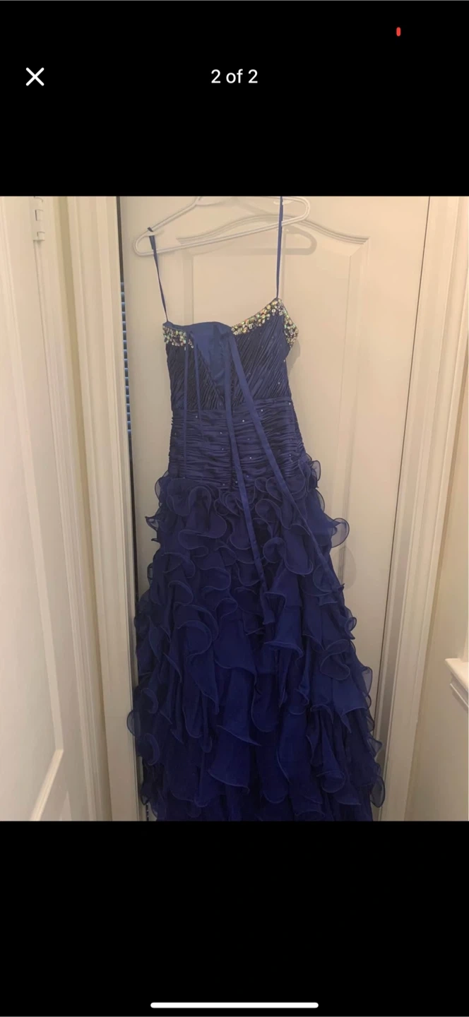 Selling a beautiful blue strapless formal dress. It features a ruffled skirt and embellished bodice. Perfect for prom or any special occasion!