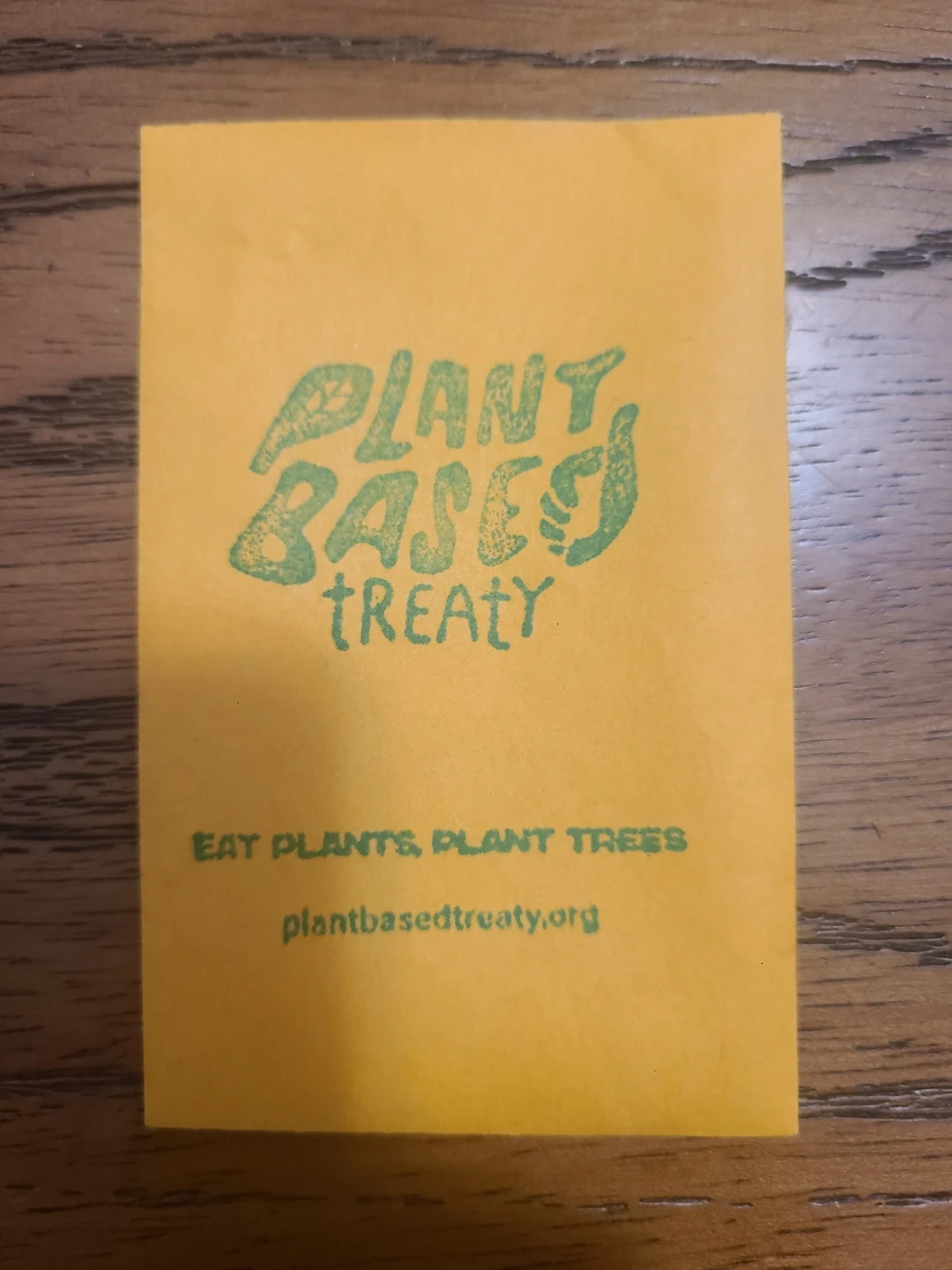 Seed packet for growing kale. 'Eat Plants, Plant Trees' is printed on the back. Visit plantbasedtreaty.org for more info. Perfect for starting your own garden!