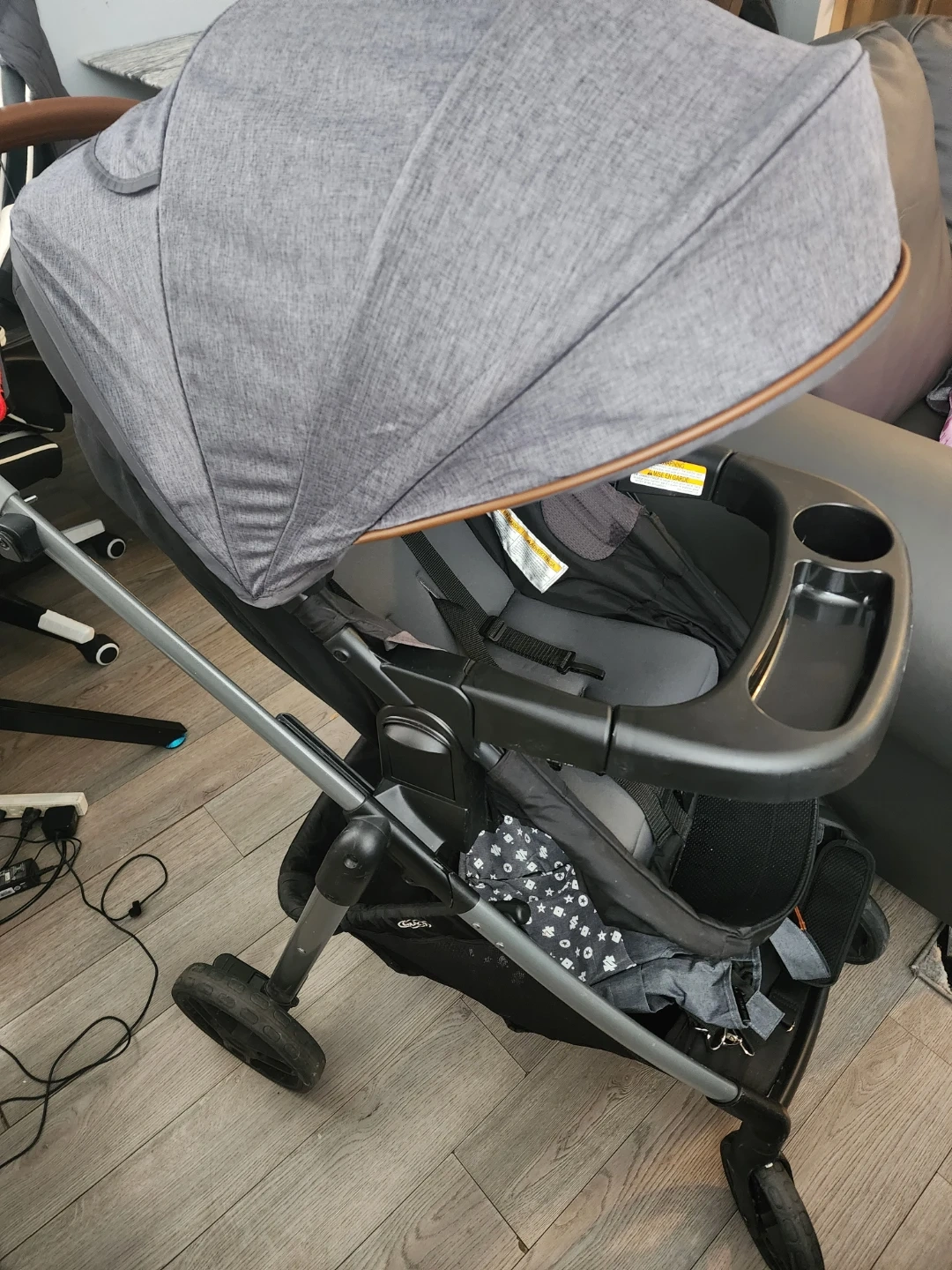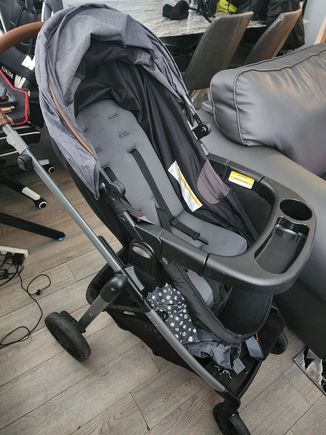 This is a grey Graco stroller. It features a comfortable padded seat and a canopy. Includes a child tray with a cup holder.