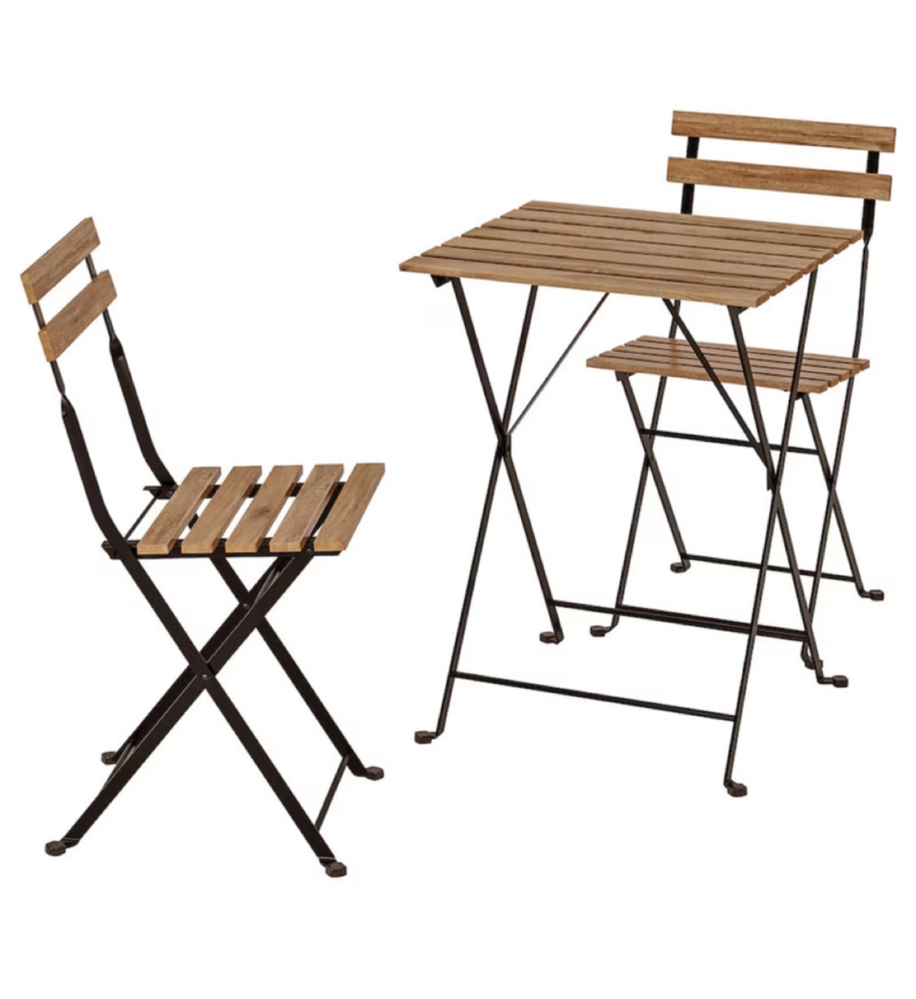 Folding bistro table and 2 chairs set. Great for small spaces or balconies. Both table and chairs fold up for easy storage.
