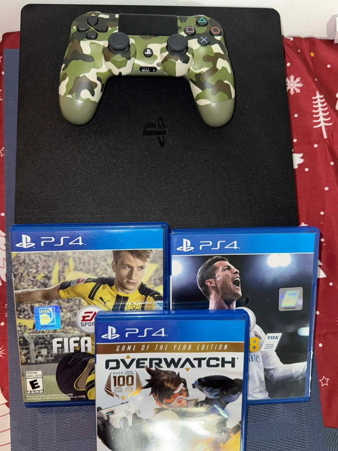Selling a PlayStation 4 slim (1tb) console with a camouflage controller. In good condition and very quiet. Controller almost new and good condition. Have all cables but no box. Also included are the games FIFA and Overwatch (Game of the Year Edition). Great for some fun gaming!