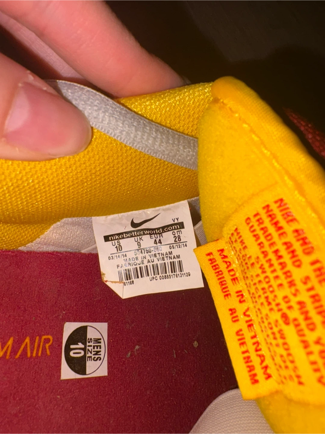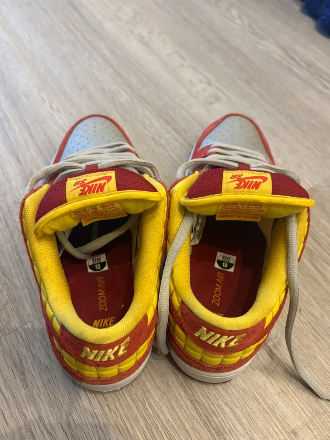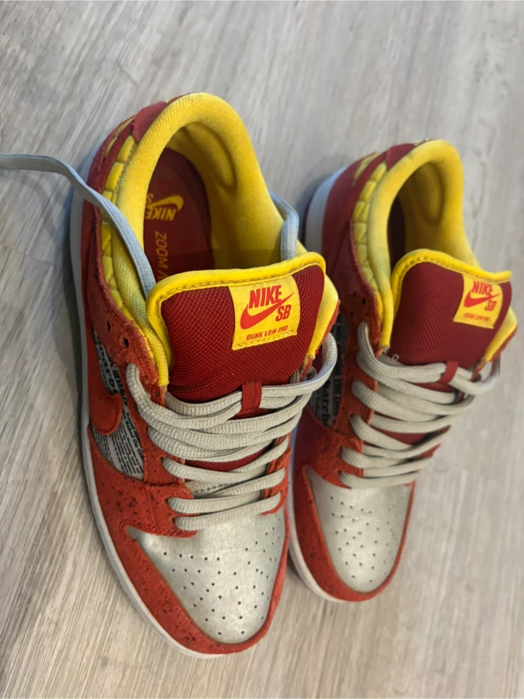 These are Nike SB Dunk Low sneakers in a red and yellow colourway, officially known as the "Rukus Crawfish" special edition. They're a men's size 10 and were made in Vietnam. These shoes feature a unique design with newspaper-style print accents.