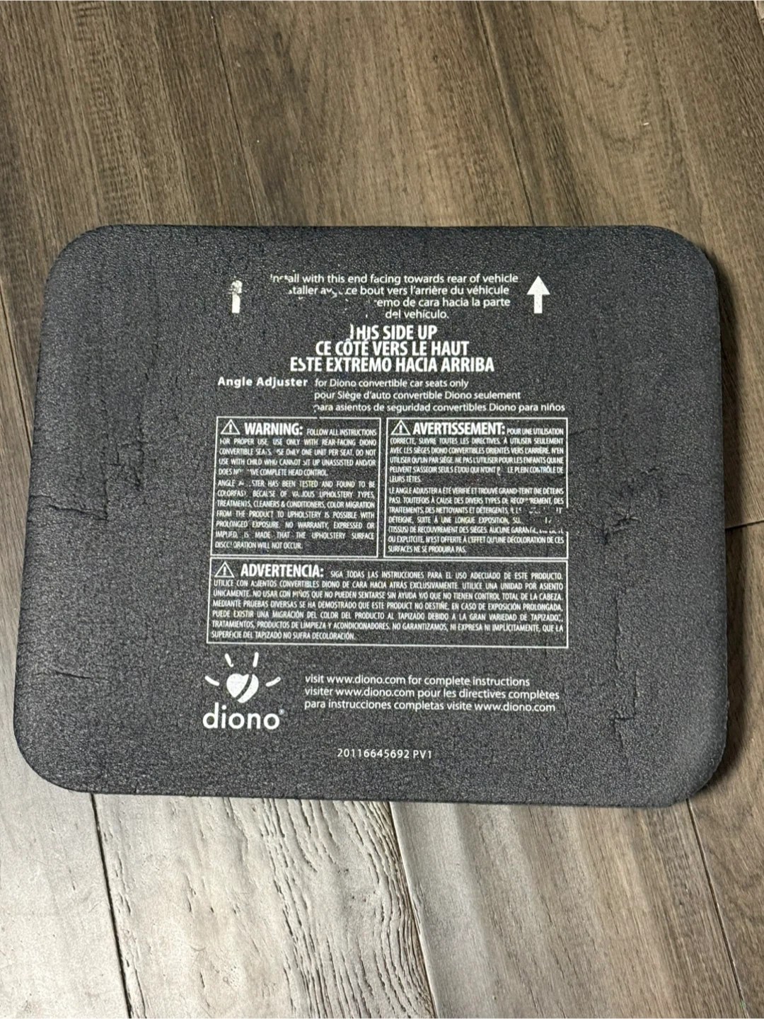 This Diono angle adjuster pad provides a flatter surface for car seats. It's made of foam material for comfort. Visit diono.com for complete instructions.