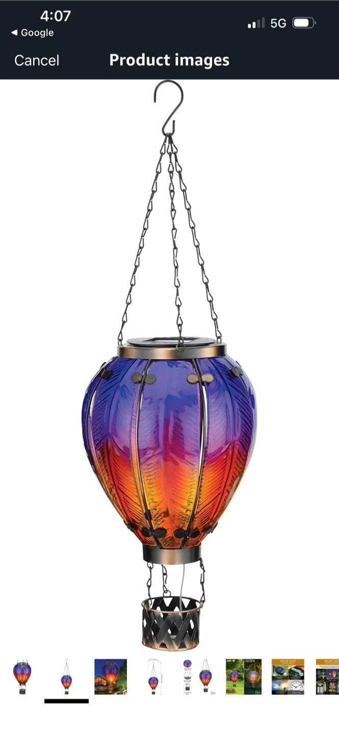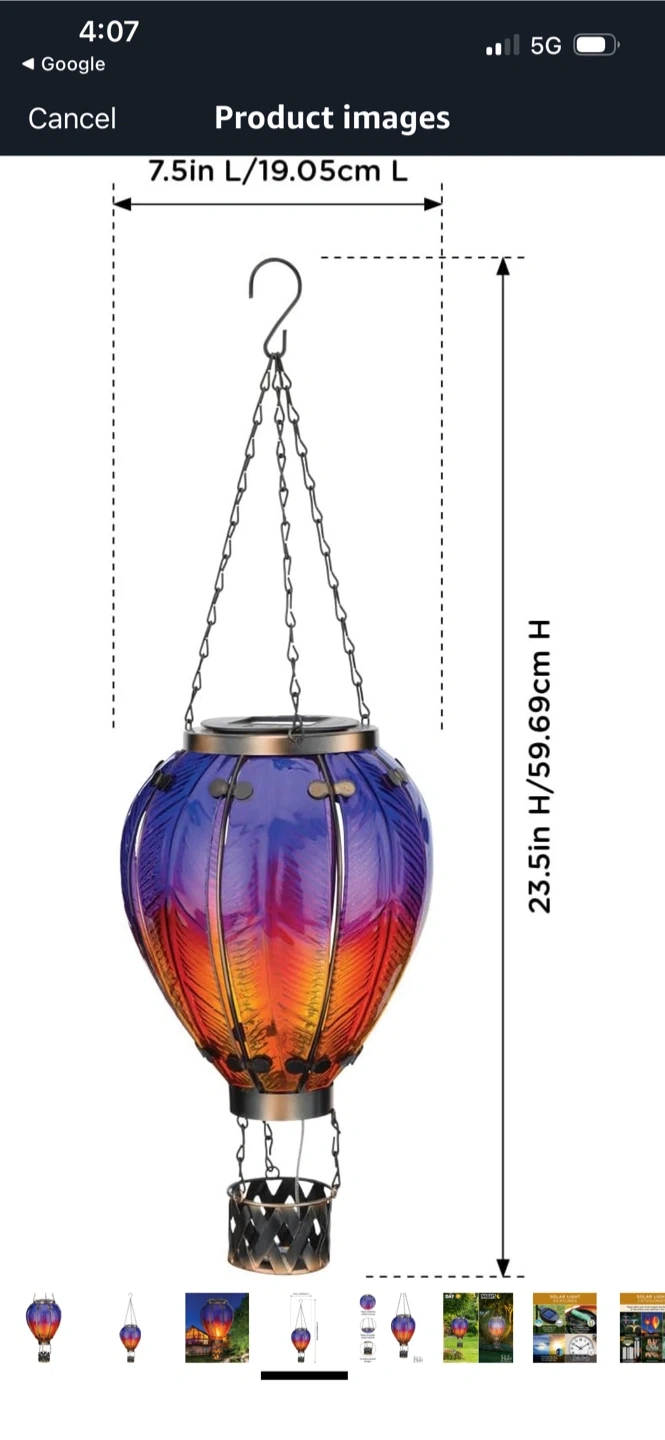 This Regal Art & Gift hot air balloon solar lantern features a colourful glass design. It's made of quality metal material and is hand-crafted. It's 23.5 inches high and 7.5 inches long. This lantern would add a lovely touch to any outdoor space!